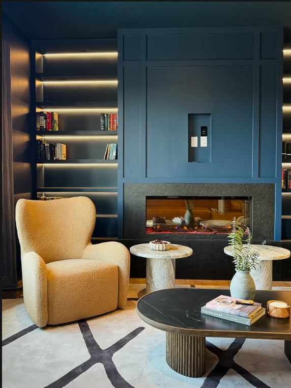 add books and decorations to bookcase add wall mounted tv over fireplace add realistic small flame inside fireplace