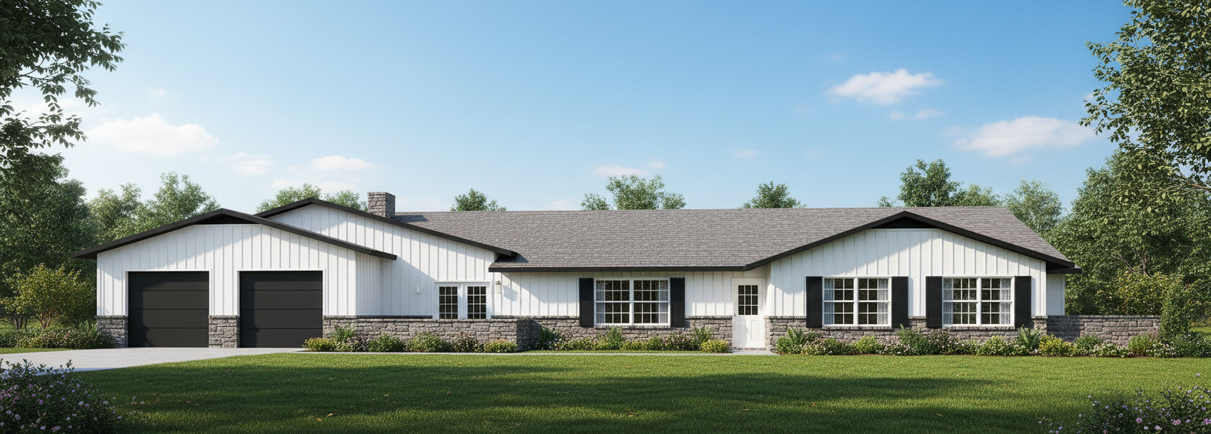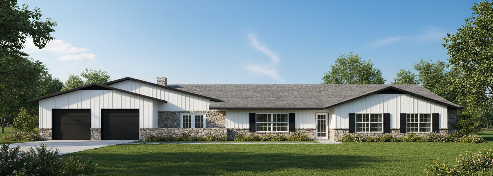 the body of this house will be white board batten style siding installed vertically and from the top of the 40 high kusman stone wainscot arounf the base of the house the roof shingle will be a medium gray asphalt shingle the chimney adjacent to the garage will also have the existing kusman stone on it the white single hung windows will have black shutters on each side use black for the roof fascia the two openings on the left are section garage doors i need a stone wall to extend from the right side of the garage to the right 16 the glazed opening behind wall will be a pair of white arcadia doors with divided light add the chimney from my image with the kusman stone remove the stone wall extending from the right side of the house remove the stone on the house adjacet to the arcadia patio doors do not vary from the drawing inage i have loaded there is a window were the arcadia doors are shown change the window adjacent to the right side of the garage to a pair of arcadia doors with divided lights add muntins to the bottom sash of the single hung window