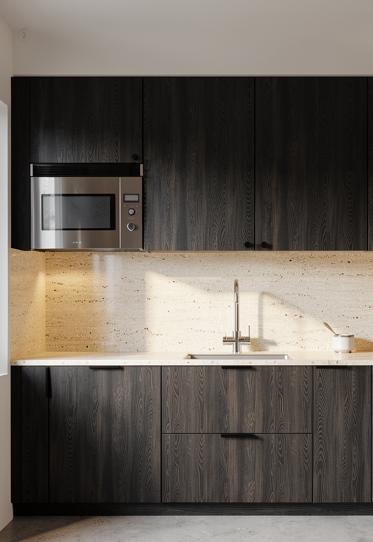 create a photorealistic rendering of a modern kitchen interior a man is standing in the kitchen his height reaching just up to the bottom of the microwave he is drinking a glass of water on the countertop there is modern kitchen decor in brass adding a warm and elegant accent to the space the lighting should be soft and natural highlighting the materials textures and the realistic interaction of the man within the environment focus on detail realism and a balanced modern atmosphere