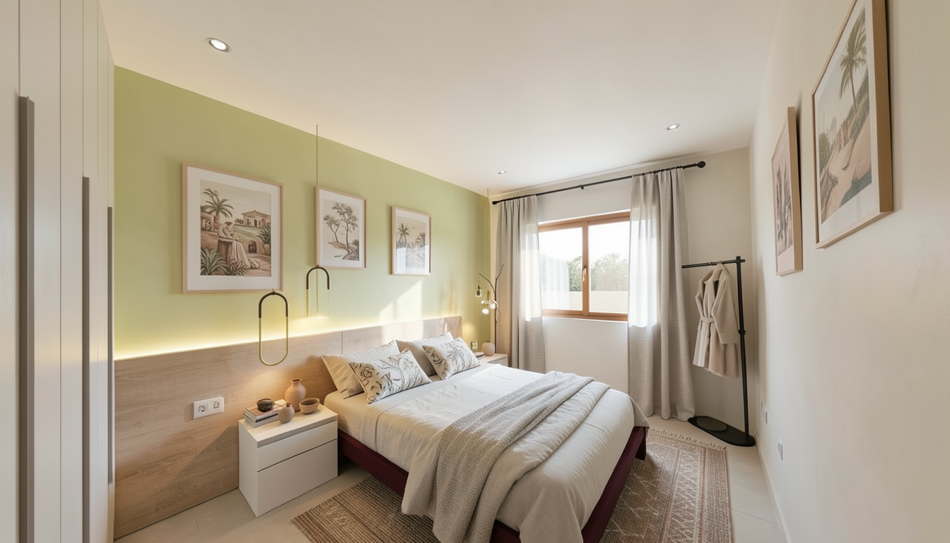 cambia el color verde de la pared por un color microcemento color claro blanco o crema blanco