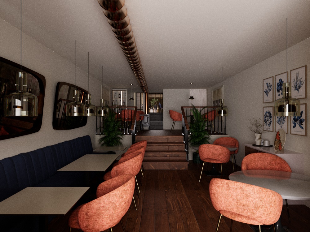 use the provided image as a fixed base maintain color mode preserve exactly the same geometry architecture camera position perspective ceiling height exposed central pipe stairs floor layout walls and furniture placement do not modify proportions or spatial configuration enhance the scene into an ultra photorealistic render of a refined and intimate luxury restaurant materials high end realism the sofa must be upholstered in super realistic velvet rich tactile soft touch velvet with visible fabric grain subtle sheen natural folds and realistic light absorption it must look deep and luxurious not flat not glossy not plastic the chairs must maintain their color but appear more refined with premium upholstery and realistic texture depth the mirrors must become vintage mirrored panels slightly warm toned reflective surface with subtle antique effect they must have a brunished metal frame dark bronze gunmetal tone add soft integrated backlighting behind the mirrors creating a warm halo glow effect on the wall pendant lamps must be extremely realistic with refined brushed brass finish high detail reflections correct light refraction metallic depth and subtle imperfections they must create a strong wow effect while remaining elegant and coherent with the space wooden flooring must show natural grain variation micro texture and realistic reflection table styling all tables must be adorned with a luxury table setting elegant porcelain plates fine crystal wine glasses refined cutlery with metallic reflections subtle cloth napkins everything must look high end restaurant quality perfectly scaled and naturally arranged lighting mood create a warm and sophisticated luxury dining atmosphere general ambient lighting like an upscale restaurant 2700k 3000k warm tone add discreet recessed spotlights aligned along the existing central ceiling pipe pendant lamps must emit warm diffused glow mirrors backlighting must enhance depth and intimacy soft shadows realistic falloff cinematic contrast avoid flat lighting or overexposure atmosphere the space must feel intimate elegant warm contemporary luxury cinematic lighting strong material depth high realism refined reflections ultra photorealistic premium restaurant mood
