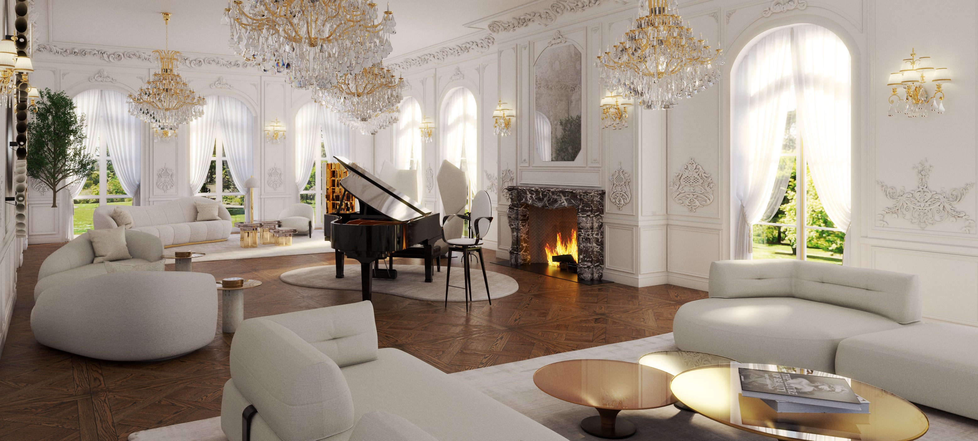 enhance this rendering to be more realistic adding soft natural lighting through the room keeping the furniture and materials texture the same