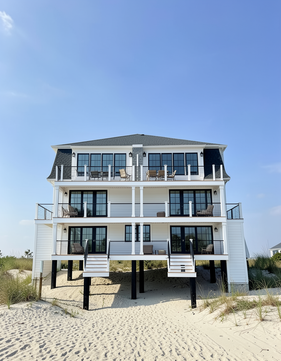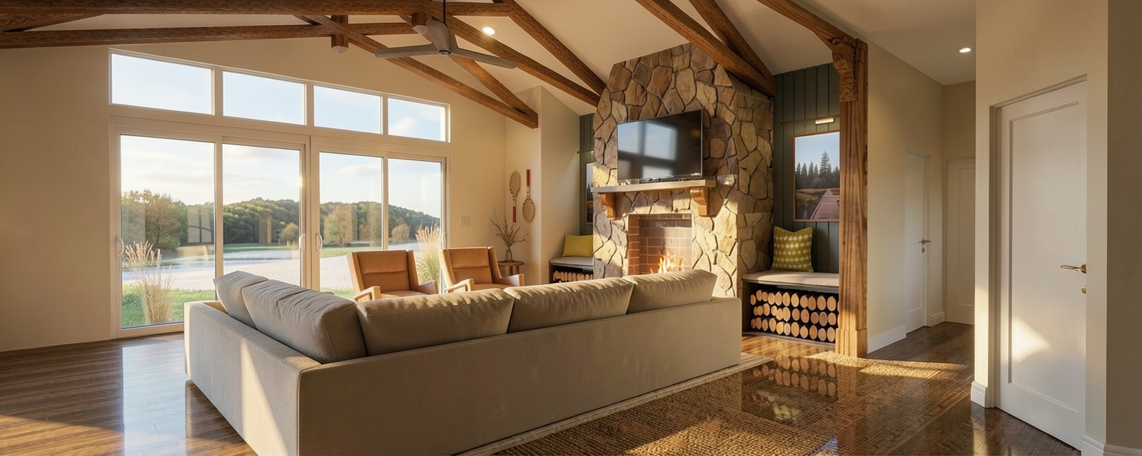 create a 3d visualisation keeping all materials and design the same add some trees to the background and a car in front of the house