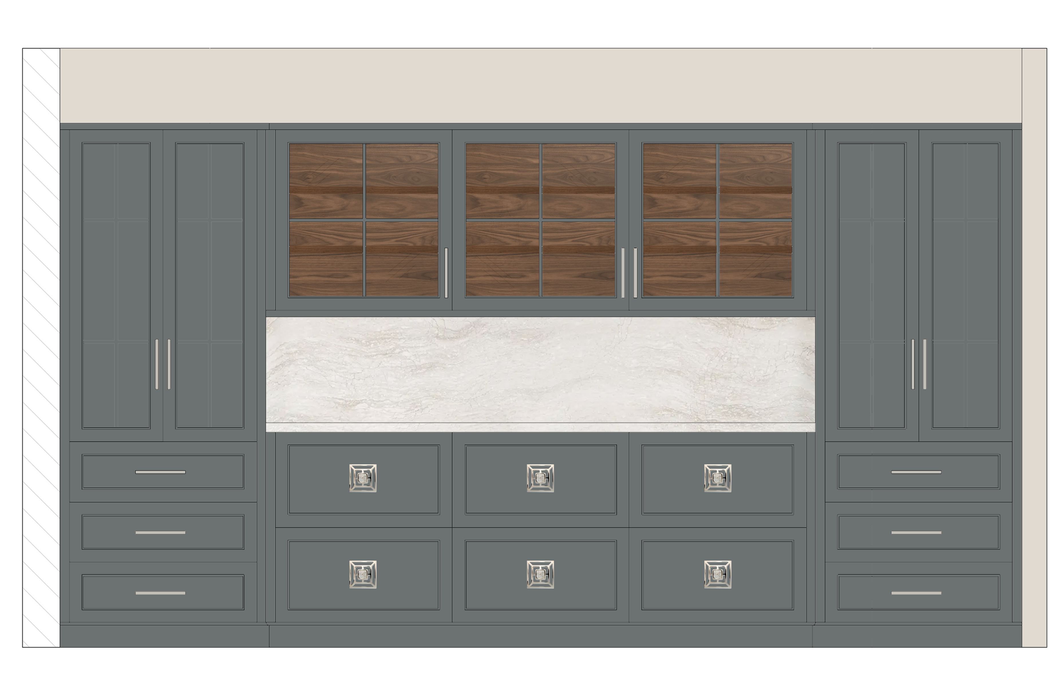 thicken the grid on the glass doors add undermount cabinet lighting make the glass clear change the outside of the glass cabinets back to the blue color but leave the inside walnut
