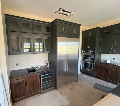 do not change the cabinets in any way preserve the exact cabinet colors materials finishes dimensions door and drawer styles hardware spacing alignment and all geometry exactly as shown do not alter the countertop shape backsplash appliances flooring lighting fixtures or wall structure only remove the construction materials clutter and mess from the scene clean the room and make it look finished and staged add a few simple tasteful home accessories appropriate for the style of the space but do not add or remove any furniture windows or architectural elements maintain the original lighting direction and realism enhance clarity and polish the photo while keeping the cabinetry and room design completely unchanged do not alter the lighting to keep the cabinet colors as they are in the image add flooring add a faucet to the sink soften the glare of the glass and fridge fill the hole in the ceiling stage for a kitchen