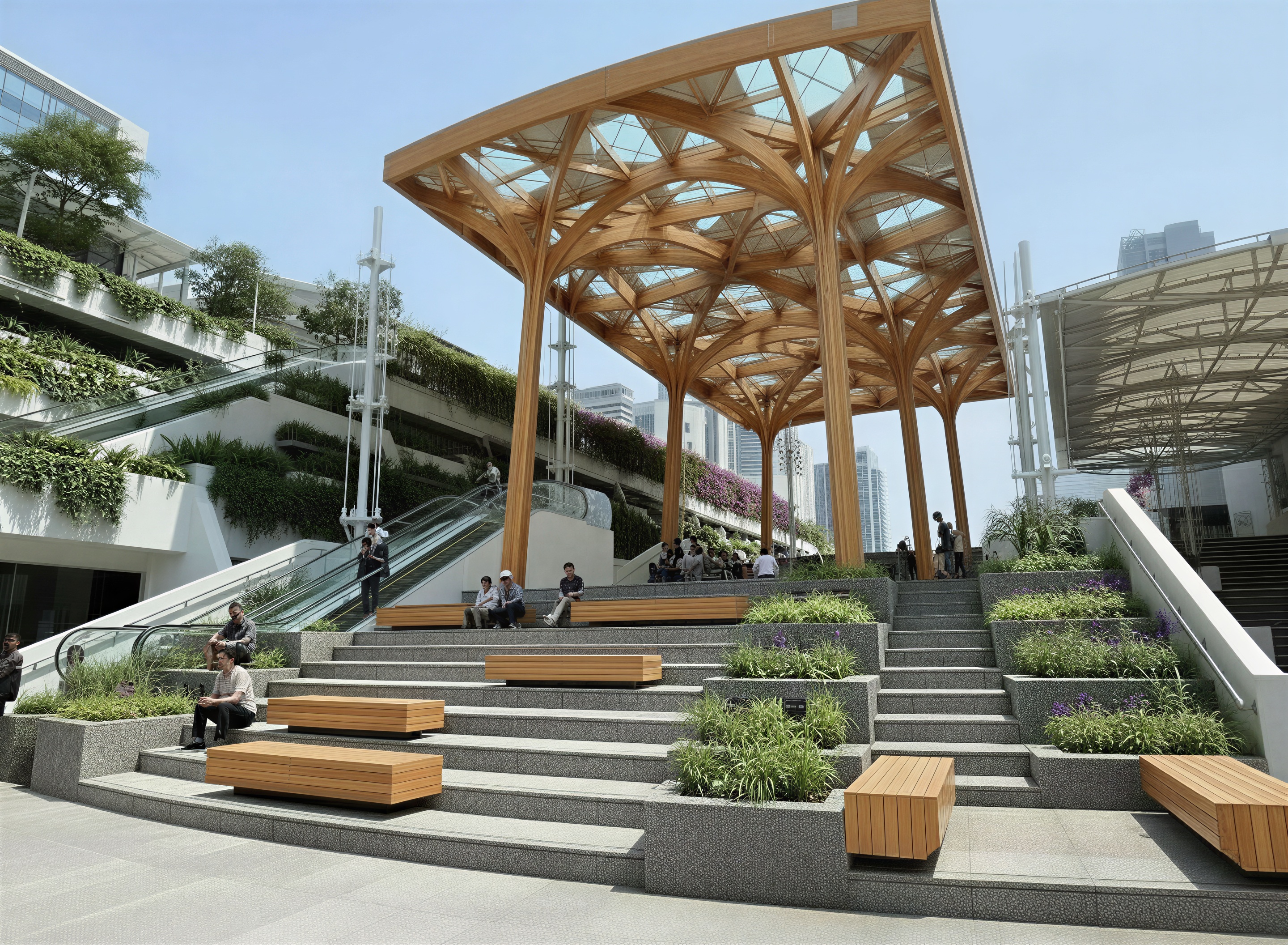 exterior shot to change the timber etfe canopy to a white etfe canopy like the reference