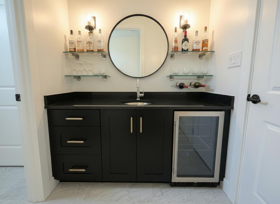 use these cabinets and turn it into a wet bar between walls with flush fillers