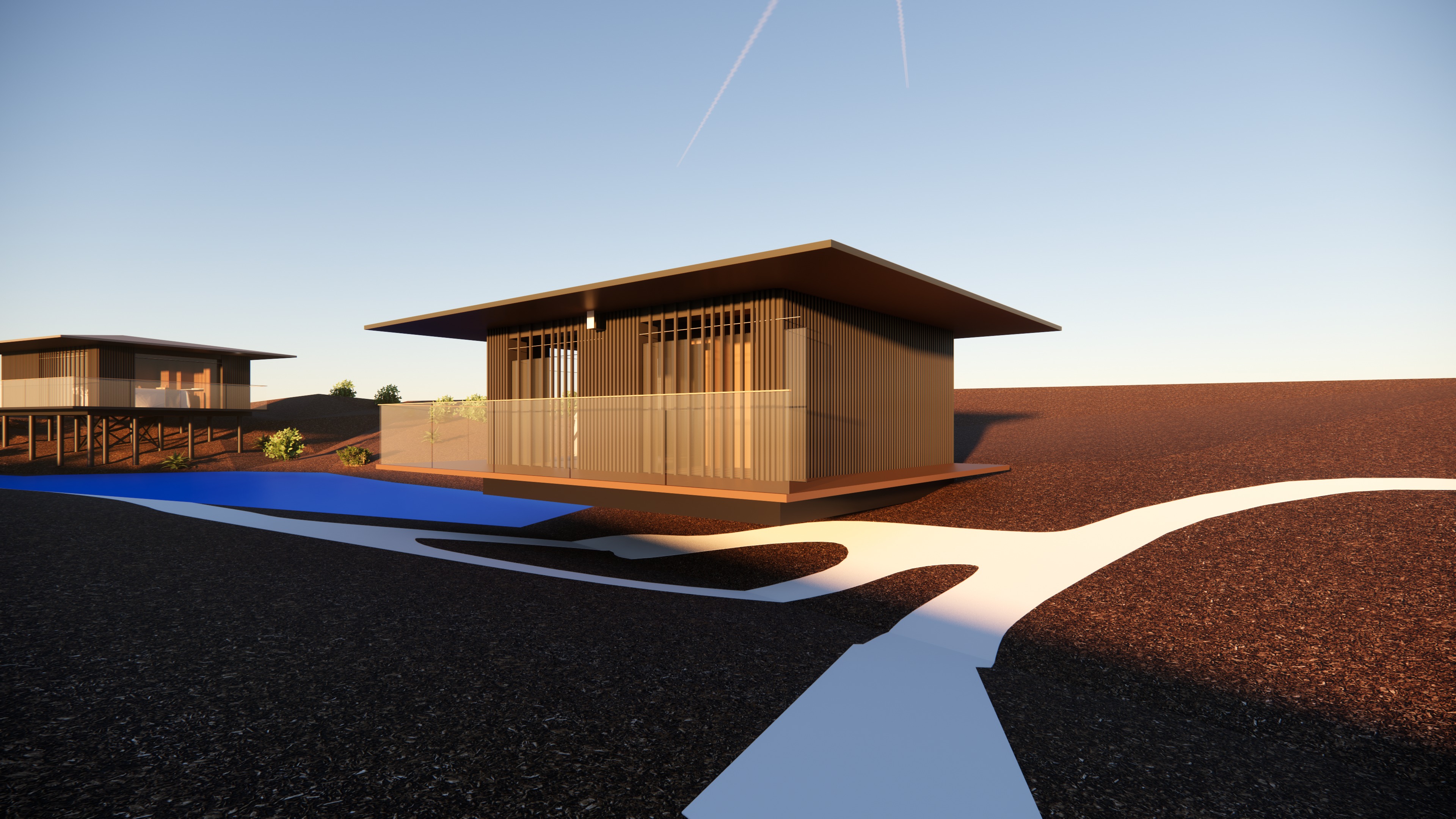 this is a house on top of small pond with small trees in the background the wall material is black burned wood please make it realistic and leave the landscape as it is the ground is dark brown with lush deciduous plants add darmera peltate plants under the house and around waterleave the original structureopenings are in dark black
