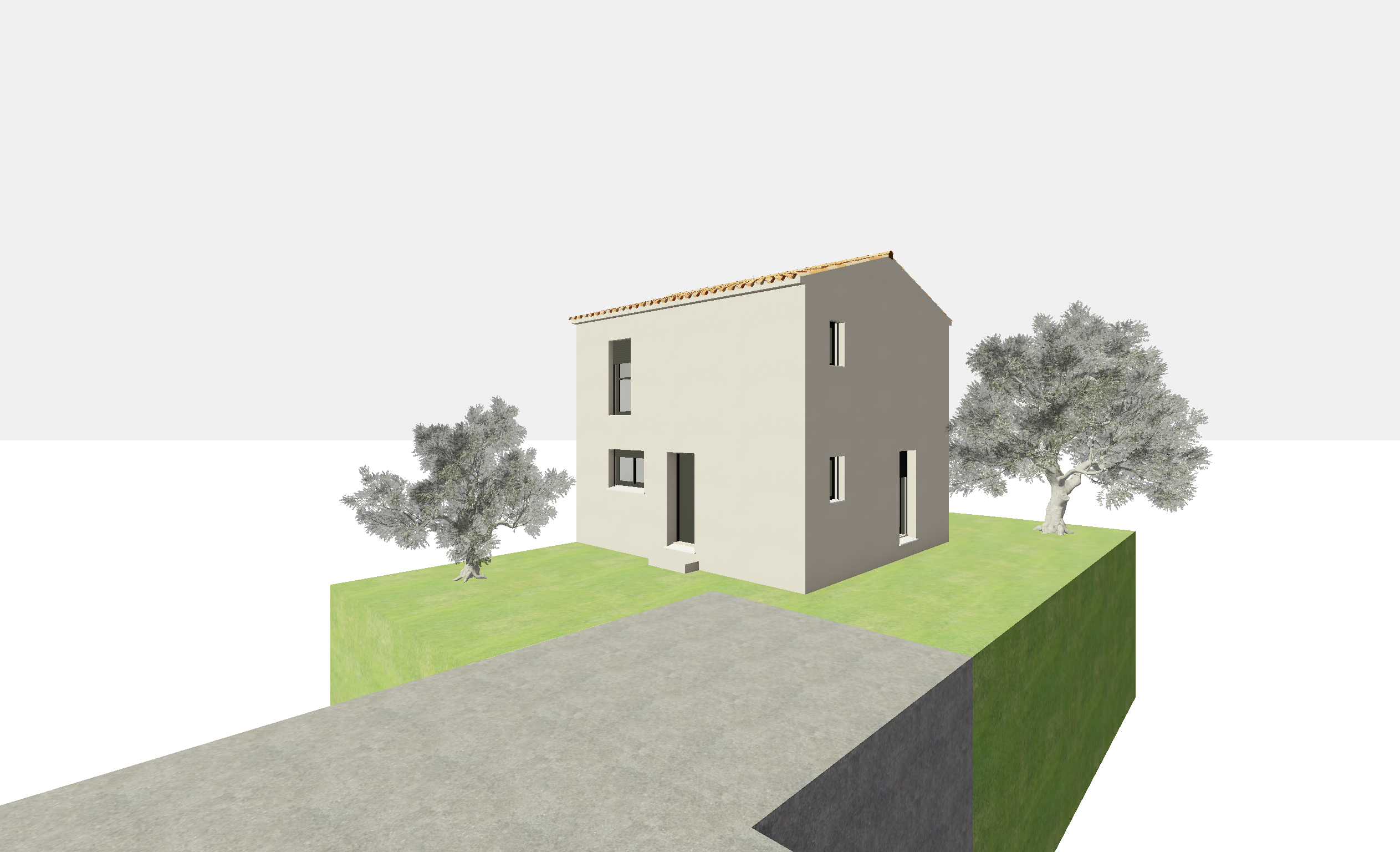 reflects on the windows mediterranean trees and villas in the background add some olive trees near the house a bit of sun on the facade ajoute des lauriers roses sun set in orange and pink sky more trees in the background the facade is more beige more reflects on windows