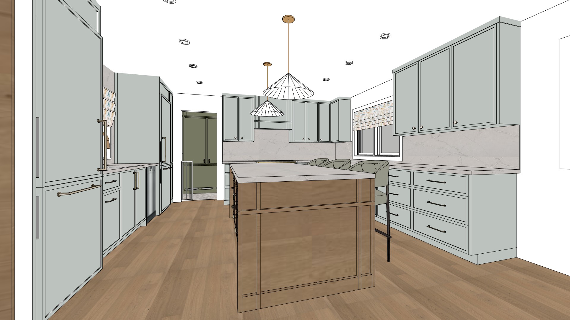 large transitional kitchen interior eye level perspective looking straight toward the island balanced and symmetrical composition kitchen features full height perimeter cabinetry in a soft green gray tone clearly reading as cool toned blue with a subtle gray undertone matte painted finish the color is muted and refined not green not warm and not saturated cabinet doors are classic shaker style with clean recessed panels and subtle frame detailing all cabinetry hardware is in a warm brushed brass finish including pulls and knobs on the left wall tall integrated cabinetry with two panel ready refrigerators fully clad in matching blue gray millwork panels seamless and flush with surrounding cabinets adjacent tall pantry style cabinets continue the same finish and detailing the back wall features additional upper and lower cabinets in the same blue gray tone with a full height light stone slab backsplash in a soft off white tone with subtle natural veining continuous and uninterrupted behind all cabinets centered in the space is a large rectangular kitchen island the island base is finished in natural light oak wood with visible vertical grain and flat recessed panel detailing the island countertop is a light stone surface with soft veining slightly eased edges clean and minimal one side of the island includes integrated drawers with brass pulls the opposite side is a solid oak wood panel on the right side of the island three counter height stools with slim black metal frames and upholstered seats and backs in a muted green fabric are neatly aligned above the island hang two pendant lights each with a warm brass canopy and stem the pendants feature a pleated fluted white shade in a wide conical shape softly diffusing light downward flooring throughout the kitchen is wide plank natural oak wood flooring in a light neutral tone with subtle variation laid straight and evenly ceiling is white with multiple evenly spaced recessed round downlights providing soft even illumination no dramatic shadows neutral daylight balanced lighting on the right wall lower cabinets with drawers and upper cabinets above all in matching blue gray finish a window with white trim is centered above the counter dressed with a woven roman shade in light neutral tones at the far end of the kitchen a doorway leads to a pantry or secondary space with cabinetry visible beyond in a slightly darker blue gray tone overall style is clean refined transitional with subtle traditional detailing no people no styling accessories added no changes to colors materials proportions layout or lighting architectural illustration style with clean outlines and accurate scale