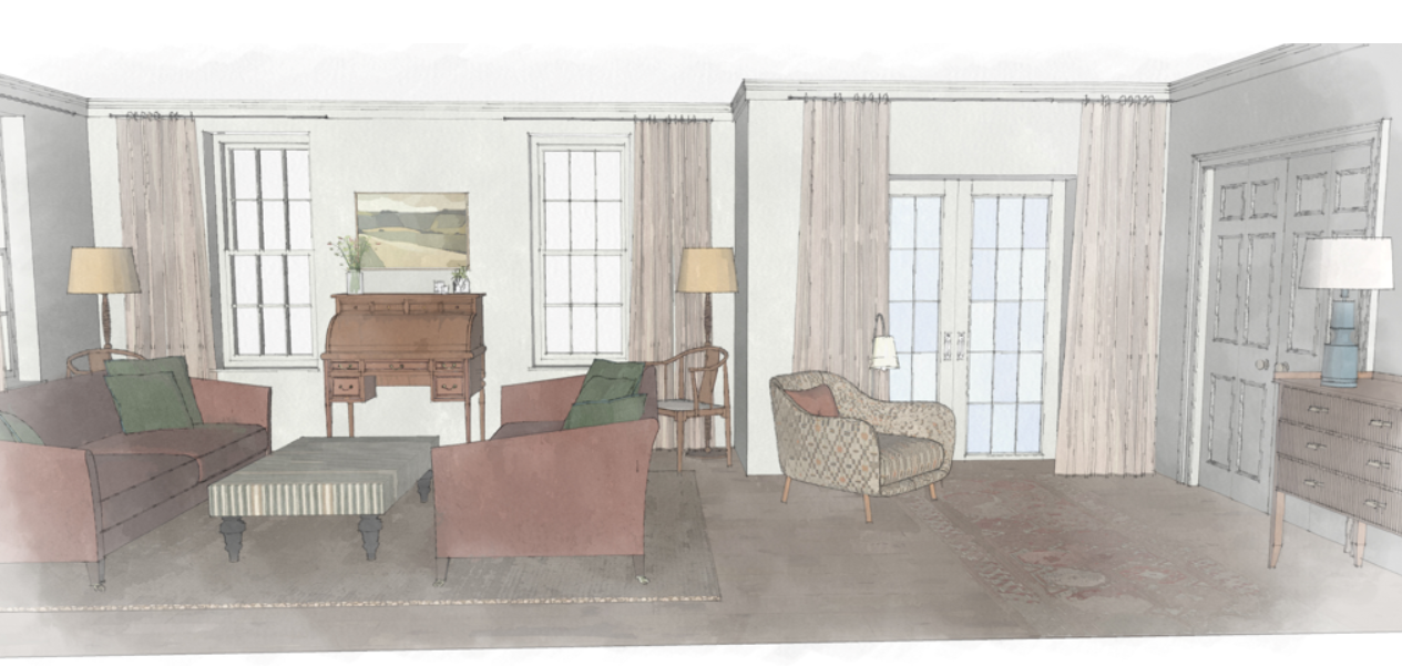 make the space look bigger larger rug under the sofas sofas to be darker in colour the long rug should be more rust rather than red the chest of drawer to the right hand side should be much lower than shown the ottoma between the sofas should be soft top with buttons
