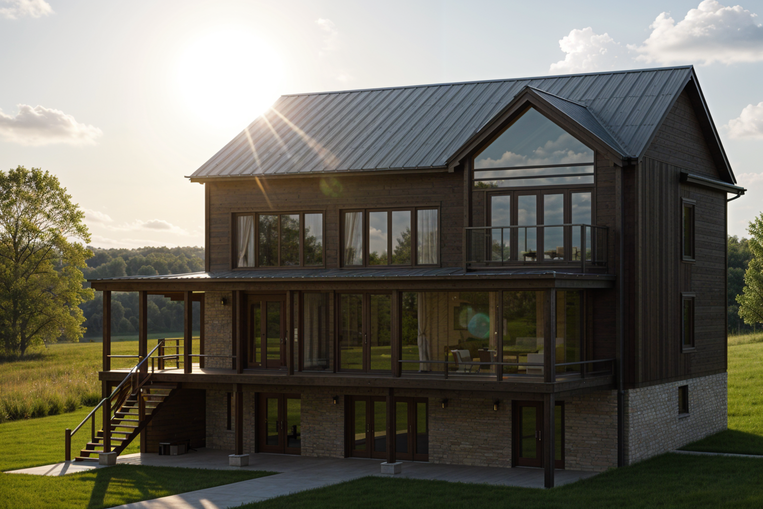 render as a craftsman style with light earth tone stone stone sill dark bronze color vertical nickel gap siding not board and batten black windows and trim dark charcoal asphalt hip style roofing with 3 steps in front and grass in foreground and trees in background