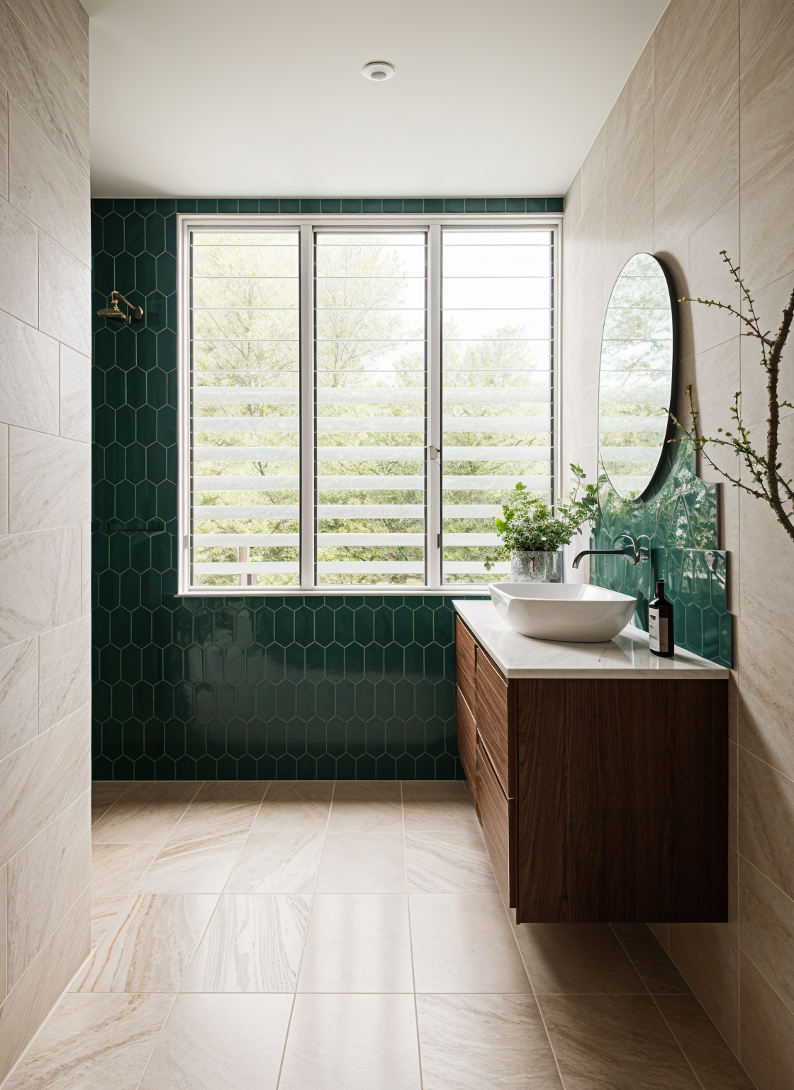 a fun girly bathroom for a tetnage girl with white shutters on the window and pink scallop style tiles