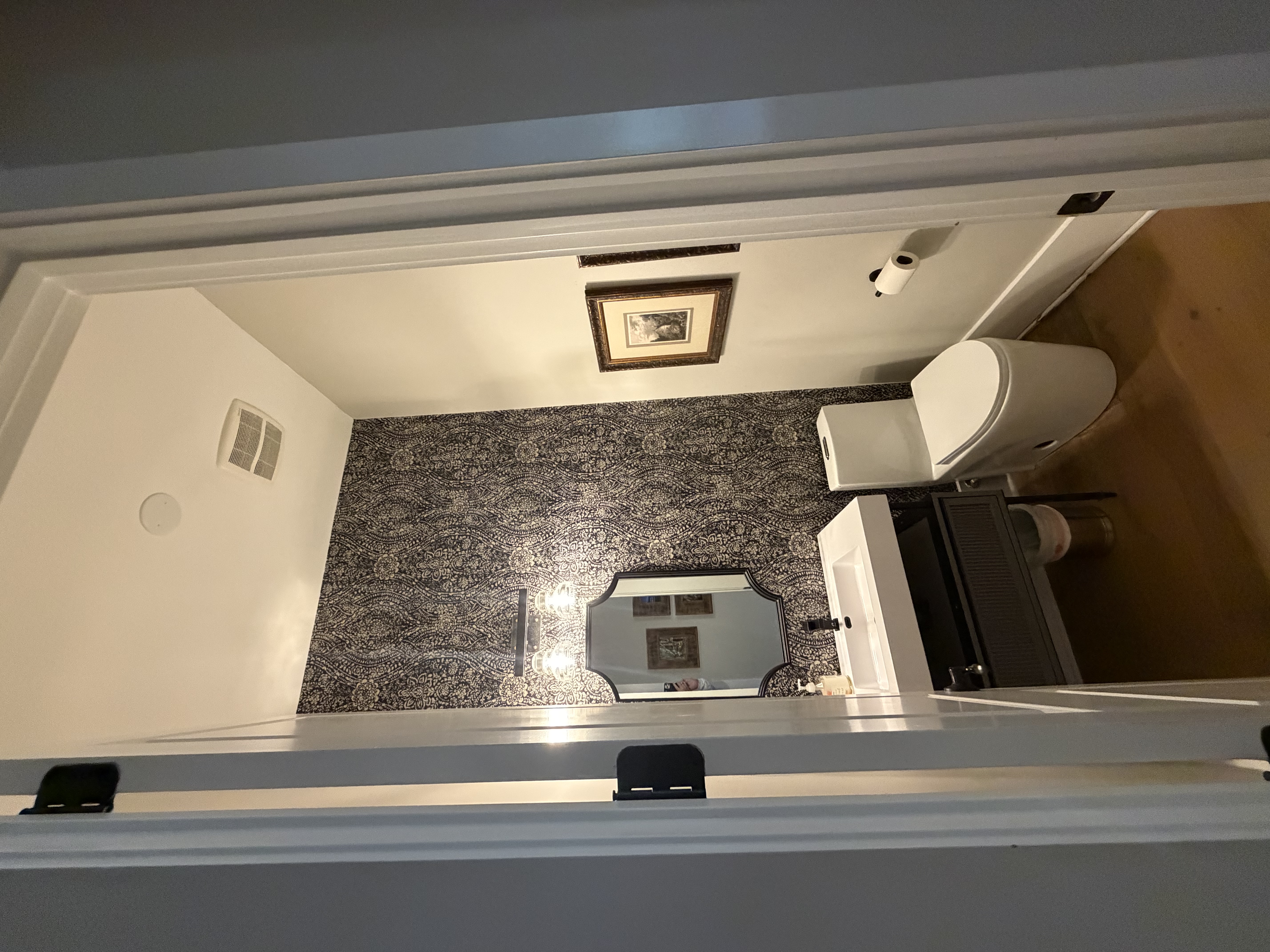 can you add a decorative white flower fixture from the ceiling that may be 16 or so and place a 2 bulb sconce light down above mirror and add taupe diamond shape tile on wall from ceiling to floor behind toilet add black 2 x 1 porcelain tile on floor architecture