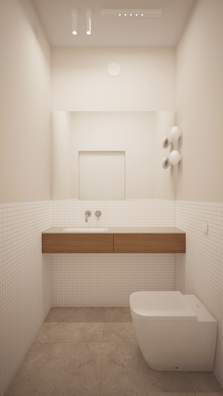 do not modify the original model geometry proportions layout structure or placement of any elements keep the exact same architecture forms and design do not alter or redesign any objects in the scene only improve the materials textures and surface details to achieve a significantly more realistic result enhance material accuracy using physically correct textures proper roughness values reflections bump normal maps and subtle surface imperfections maintain the original material intent while improving realism the scene is illuminated by ceiling lighting the lighting should feel natural and believable with realistic light intensity soft shadows accurate reflections and balanced exposure improve global illumination and realistic light interaction with all materials focus on high end photorealism through refined material definition realistic reflections subtle imperfections and natural color grading without changing the model geometry layout or design in any way colour balans is neutral