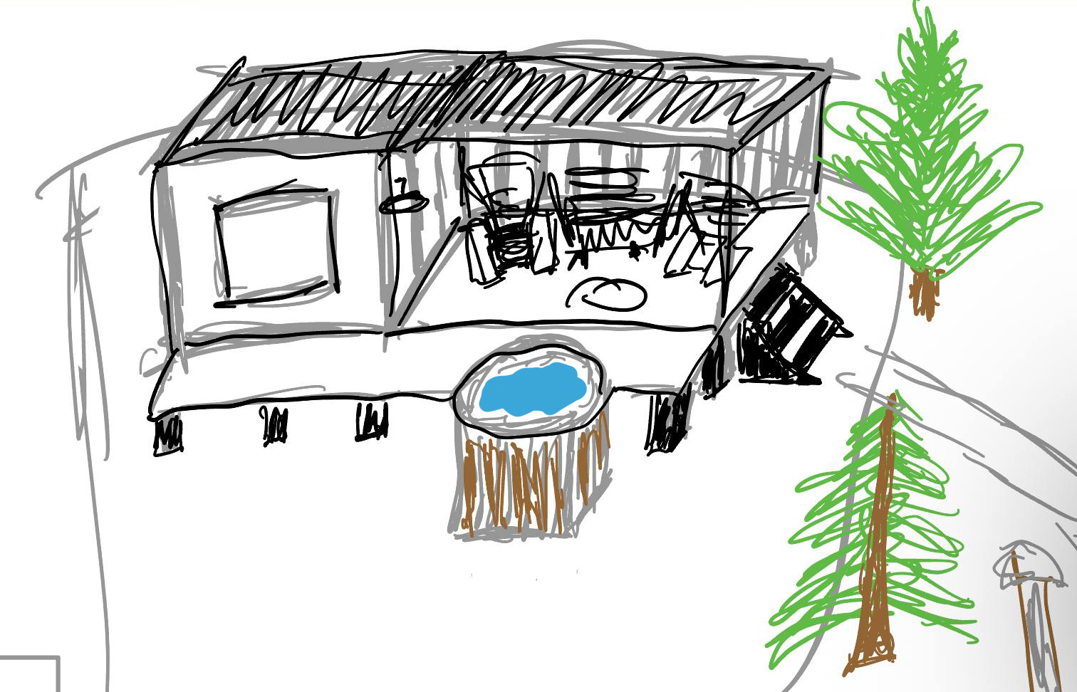 modernist exterior shot a cozy cabin in the woods surrounded by lush vibrant green pine trees the cabin is made of rustic wood with a warm brown hue exuding a welcoming atmosphere it has a spacious deck with a set of comfortable wooden chairs and a small table perfect for relaxation the roof is a dark charcoal gray contrasting beautifully with the natural environment in front of the cabin there s a charming round wooden hot tub with a sparkling blue surface that reflects the clear sunny sky the overall ambiance is serene and tranquil evoking a sense of peaceful retreat in nature architecture