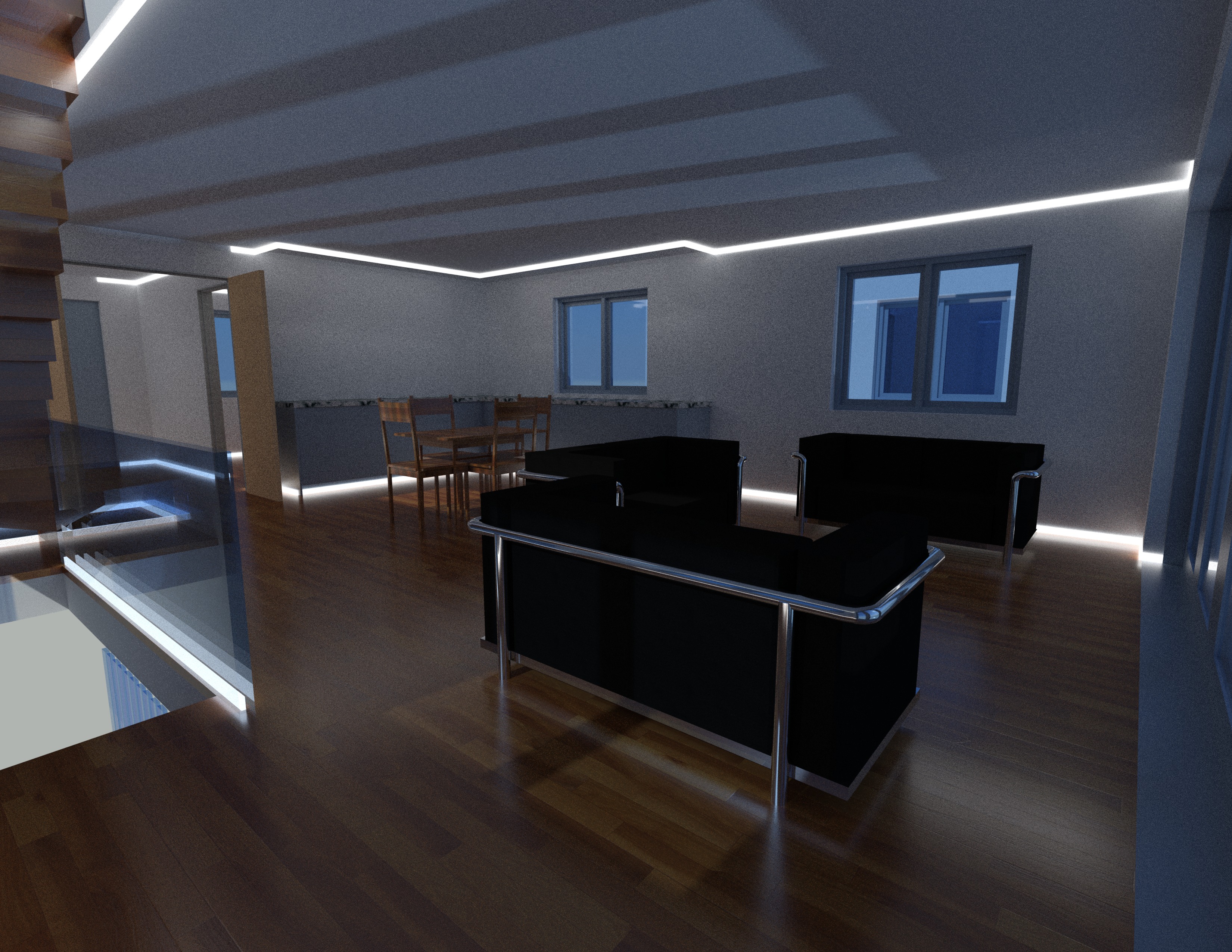the kitchen cabinets are to the rear and right of the image add an inset sink and tap along with a cooker to this section of the image also add kitchen bits and pieces to the kitchen wortops however do not add any additional kitchen cabinets add a coffee table between the sofa with wine glasses and a bottle of wine on it set the table ready for a meal the windows on the wall opposite the camera should show a garden scene through them and place pitcures to the walls
