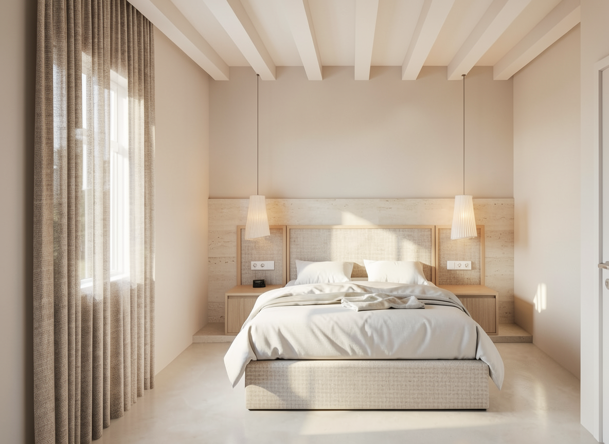 use the provided enscape render as base reference keep exact layout proportions and camera angle enhance natural lighting and refine materials add one elderly man and one elderly woman drinking coffee at table add potted plant in corner and large framed picture on the wall in the left side of the room add a coffee machine in the kitchen and a few kitchen accesories