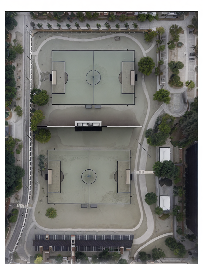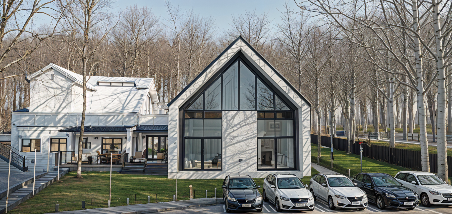 modernist exterior shot a beautifully rendered modern minimalist house set amidst a serene natural environment the house features angular wooden structures with a dark gray and black exterior large glass windows reflect the subtle hues of the surrounding landscape the wooden siding has warm earthy tones like soft browns and is combined with sleek contemporary black trimming the atmosphere is tranquil and the lighting is soft mimicking a gentle morning or late afternoon light the ground is adorned with patches of green moss and vivid yellow wildflowers adding a burst of color and life the surrounding trees are leafless drawn with delicate thin black lines indicating the late autumn season shadows of the trees create an intricate pattern on the house and the ground in varying shades of gray and brown the entire setting feels both modern and natural embracing simplicity and elegance architecture white facade keep windows from concept plain with forest in the distance please preserve the architecture and proportions of the building full black roof stell design please keep the parking lot and put cars in it behind the building we have a slope and a forest the building on the right is a church in case you put chairs inside change the backgroud to forest the building on the right edge does not exist to keep the combination of textures move the cars to the parking lot