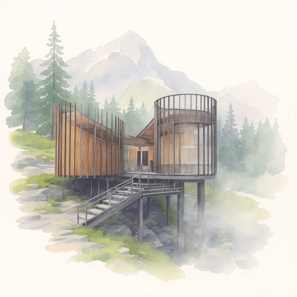 architectural watercolor rendering of a contemporary interior dayroom structure made of warm wood black steel and glass precise and realistic architectural detailing cantilevered over stone terrain surrounded by mountain pines and mist below outside off window rendered with crisp building geometry and realistic materials background and edges dissolve into loose watercolor washes and white paper edges not full bleed with soft unfinished fade around the image visible pencil and ink linework with light technical annotations artistic yet grounded balance of precision and painterly abstraction calm morning light concept architectural visualization style