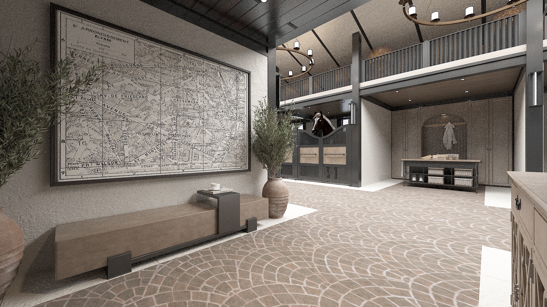 create a realistic space in the image with soft shadows and realistic reflections in the morning hours materials as in render do not change stone metal wood as in the picture with a sophisticated feeling when staying in the space and matte finish of the floor and walls do not add elements or change the image