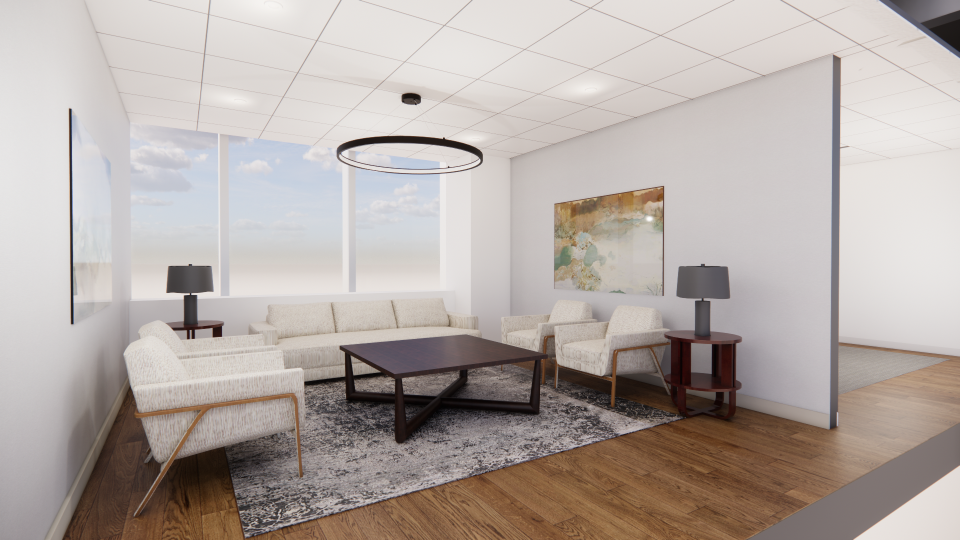 create a photorealistic rendering add midtown new york views from the 43rd floor preserve geometry materials and textures as they are change the color of the two table lamps to dark brown leather base and linen color shade keep the shape change the fabric on the four existing chairs to soft dark blue and the metal on the chair to black