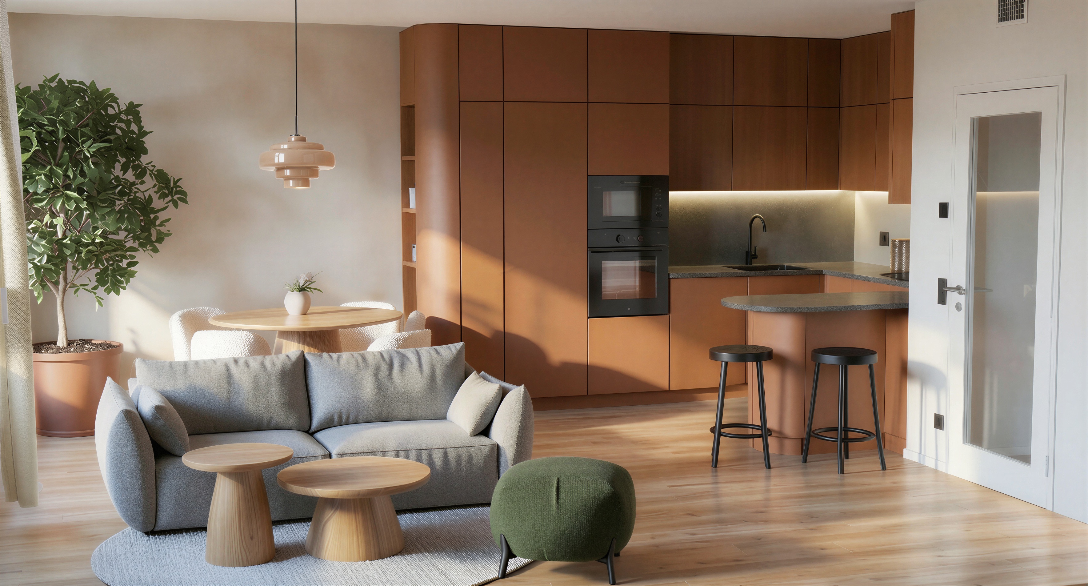 use the provided render strictly as the base image do not change the camera angle layout furniture placement or proportions modify only the color of the kitchen cabinetry that is currently brown change this brown part of the kitchen cabinets to the color ral 8004 copper brown warm terracotta brown keep the material appearance the same same texture finish reflections and shading only adjust the color to ral 8004 the lighting should remain natural and balanced avoid strong golden glow or overly warm sunlight the scene should have soft neutral daylight with only a very subtle warm tone keeping the atmosphere realistic and not overly saturated all other elements in the scene must remain exactly the same