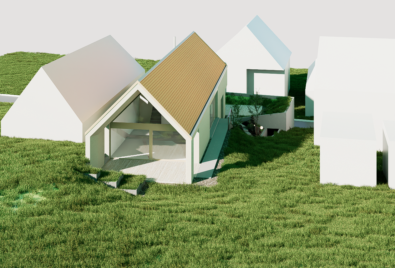 create a photorealistic architectural visualization of the provided scene from an elevated aerial viewpoint preserve all original materials colors lighting fog and the overall atmosphere of the scene exactly as they are enhance the composition by adding realistic trees in the foreground naturally integrated into the scene without altering the original design intent maintain high material accuracy realistic light behavior in fog soft shadows and a professional architectural visualization style do not change the mood weather conditions or environmental atmosphere of the scene