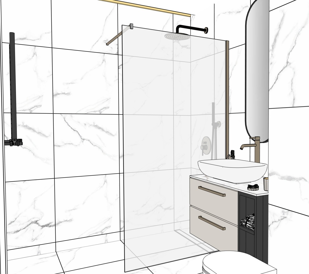 fotorealistyczna fotografia wn trza klasy premium projekt uk ad meble i materia y bez adnych zmian wzgl dem obrazu wej ciowego naturalne wiat o dzienne perfekcyjna ekspozycja naturalny balans bieli bardzo realistyczne materia y i detali zero zmian zero okien p ytki w ca ej azience wygl daj jak marmur z delikatn szar y k prysznic i bateria prysznicowa i umywalkowa jest w kolorze szczotkowany nikiel zlew i wc jest w kolorze bia ym lustro z czarn ramk z o wietleniem led za lustrem szafka umywalkowa jest w delikatnej szaro ci z czarnymi otwartymi p kami po lewej stronie jest czarny grzejnik zawie na nim dekoracyjny r cznik dope niaj cy przestrze na zdj ciu wej ciowym z lewej strony przy suficie w kolorze tym zaznaczone jest o wietlenie led
