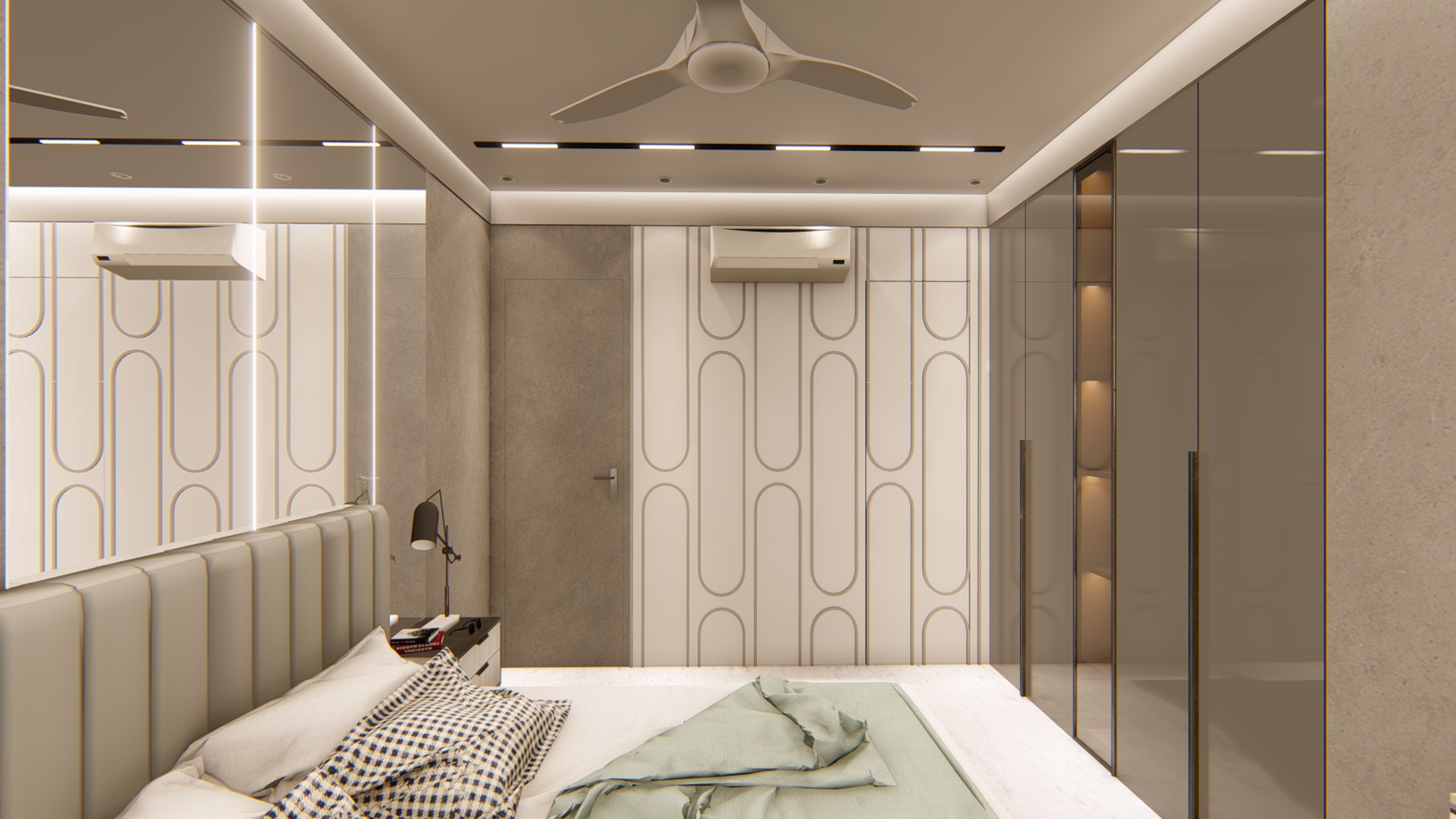 keep base image same add some light white daylight add ceiling lights with whiter shade table side lamp keep on keep white marble flooring as base image keep greyish look in the room furniture