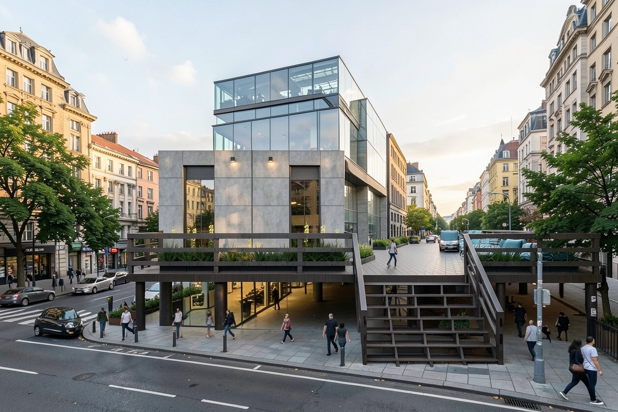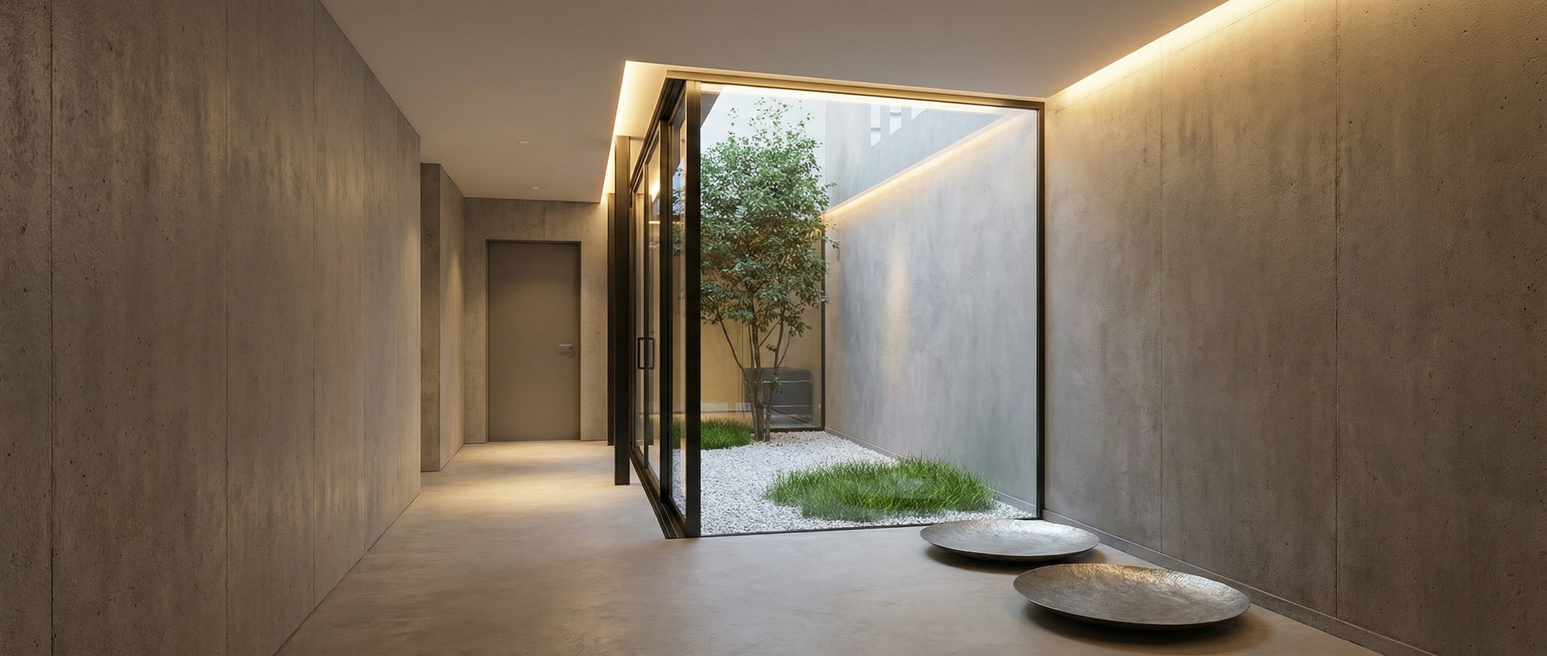 edit the provided image while preserving the exact perspective geometry glazing and composition transform the space into a bright calm minimalist scandinavian style healthcare room replace the dark concrete like materiality with smooth off white to warm light grey plaster walls light oak wood accents and a light fine grained mineral floor soft natural daylight subtle warm indirect lighting refined and serene atmosphere the room should only subtly suggest a treatment room with very minimal integrated healthcare elements and no prominent furniture keep the space mostly empty architectural hygienic and understated no people no decoration no large medical equipment no visual clutter