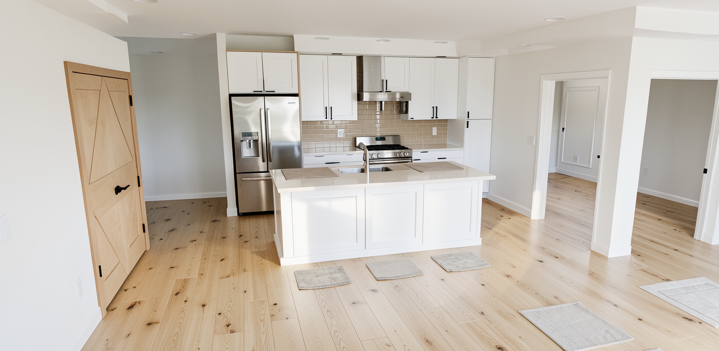 render this kitchen day time with tafisa cashmere clor cabinets matte black handles stainless appliances beige subway tile backsplash light oak flooring walls should be benjamin moore weathered white doors should be painted white molded shaker style doors and trims should be gloss white cabinet above the drife should not be glass the room on the right should have sliding barn doors with black roller track