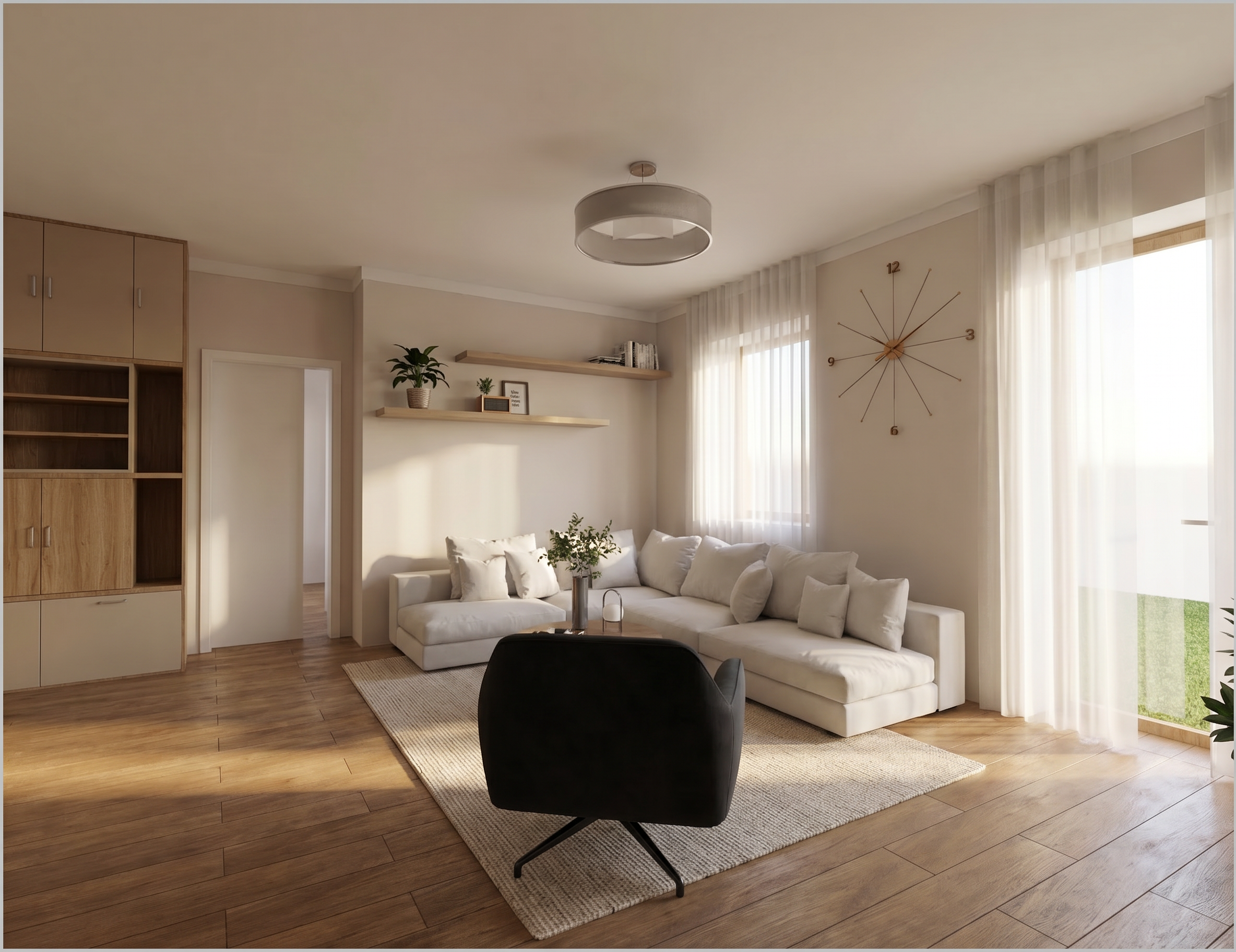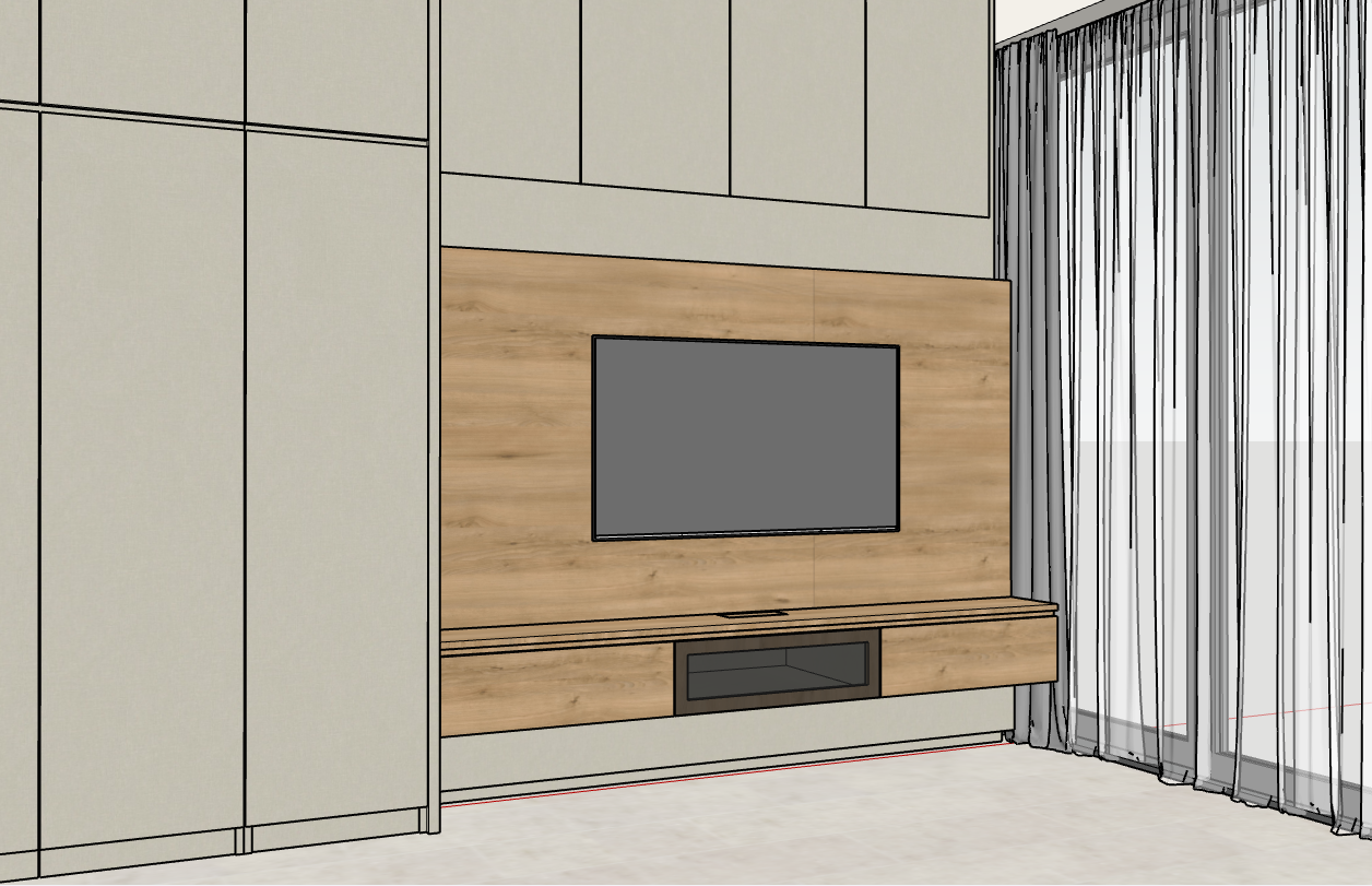 light marble flooring soft daylight from sliding doors on the right no interior light led strip light above tv wood panel led strip light below suspended tv console