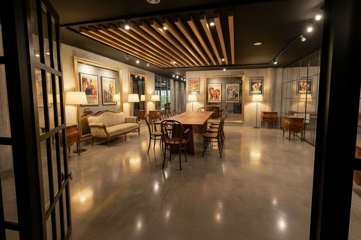 keep the ceiling panel to be white but add wood trims make the space bright and light add intricate hawaiian ilima themed elegant yellow fine mosaic art on the fascia make the scene dusk shot do not show the sun light coming into the space