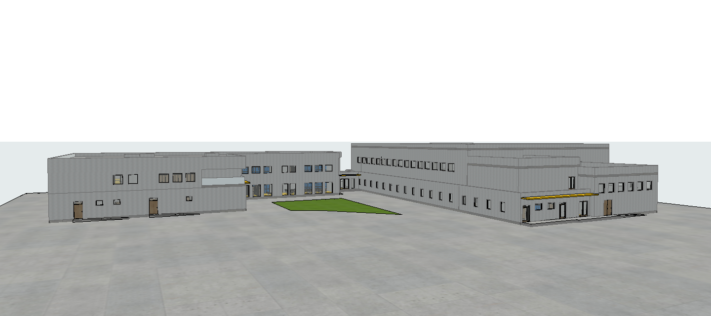 modern elementary school building contemporary architecture clean geometric design white grey and yellow facade combination anthracite window frames and doors large glass surfaces minimalistic modern style school surrounded by greenery trees and landscaped courtyard children playing and walking around the school lively atmosphere wide pedestrian paths benches and small playground elements daylight soft natural lighting blue sky photorealistic architectural render high detail realistic materials professional architectural visualization ultra realistic 4k