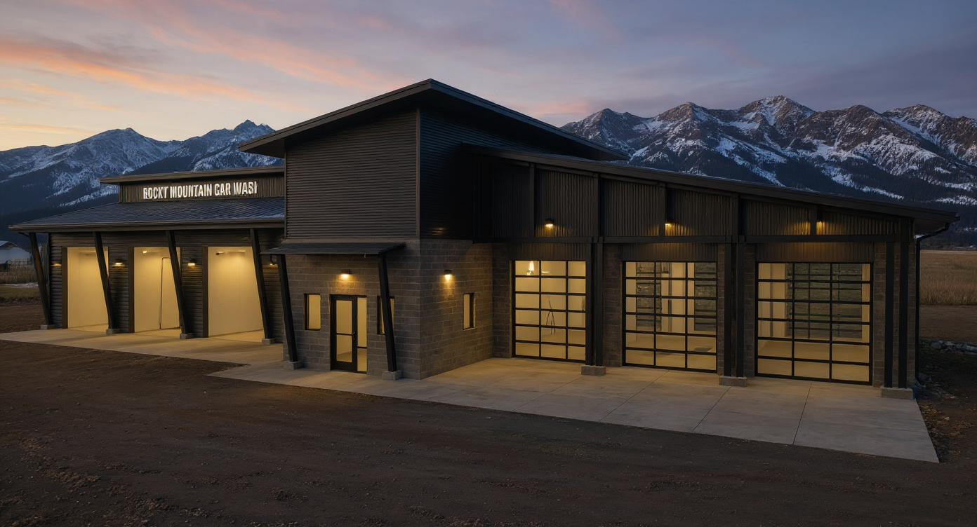 render a modern car wash building with a sleek contemporary design the structure features corrugated metal siding in shades of slate gray and charcoal with large glass doors reflecting light the roof is a silver metallic color complementing the overall industrial look the surrounding pavement is a smooth clean asphalt in deep gray enhancing the sleekness of the design the atmosphere is bright and clear with a crisp blue sky to emphasize the modern architecture and bring out the subtle textures in the materials