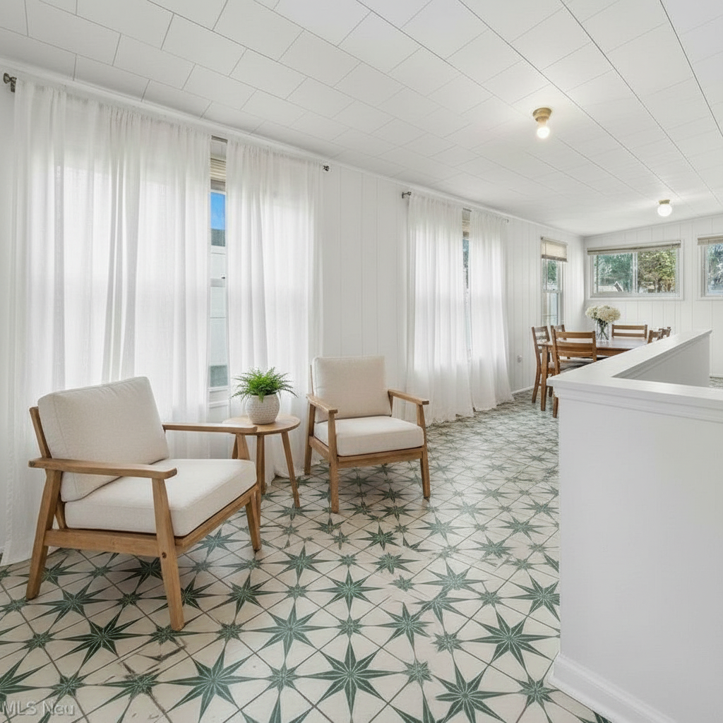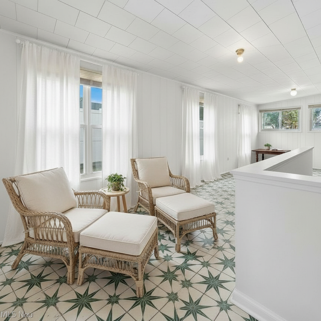 add neutral area rugs under the furniture replace the ceiling light with a fan and add floral colored pillows to the chairs