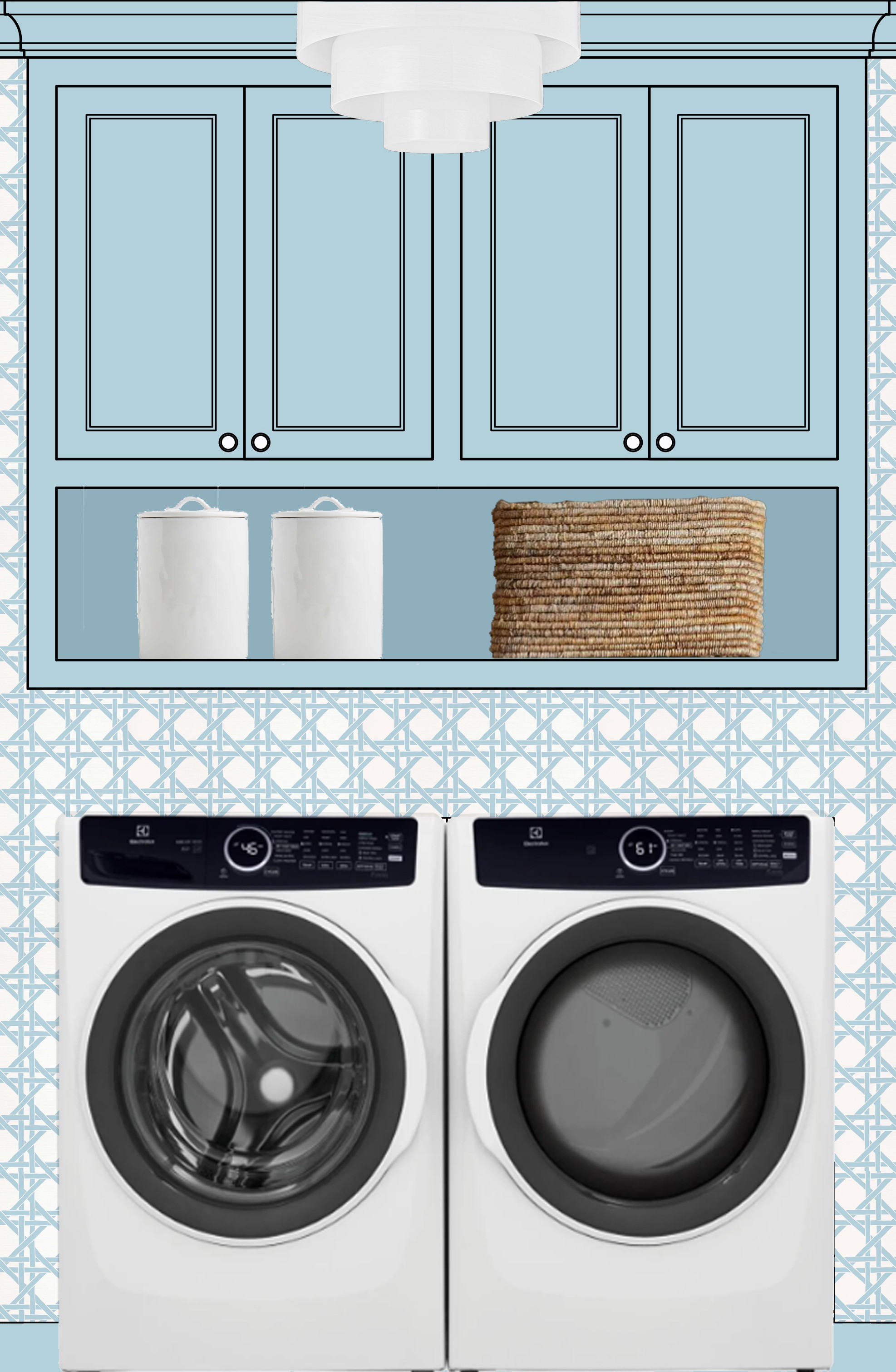 the cabinet hardware is polished nickel the light fixture is milk glass the space should be evenly well lit the baseboard should match the cabinetry