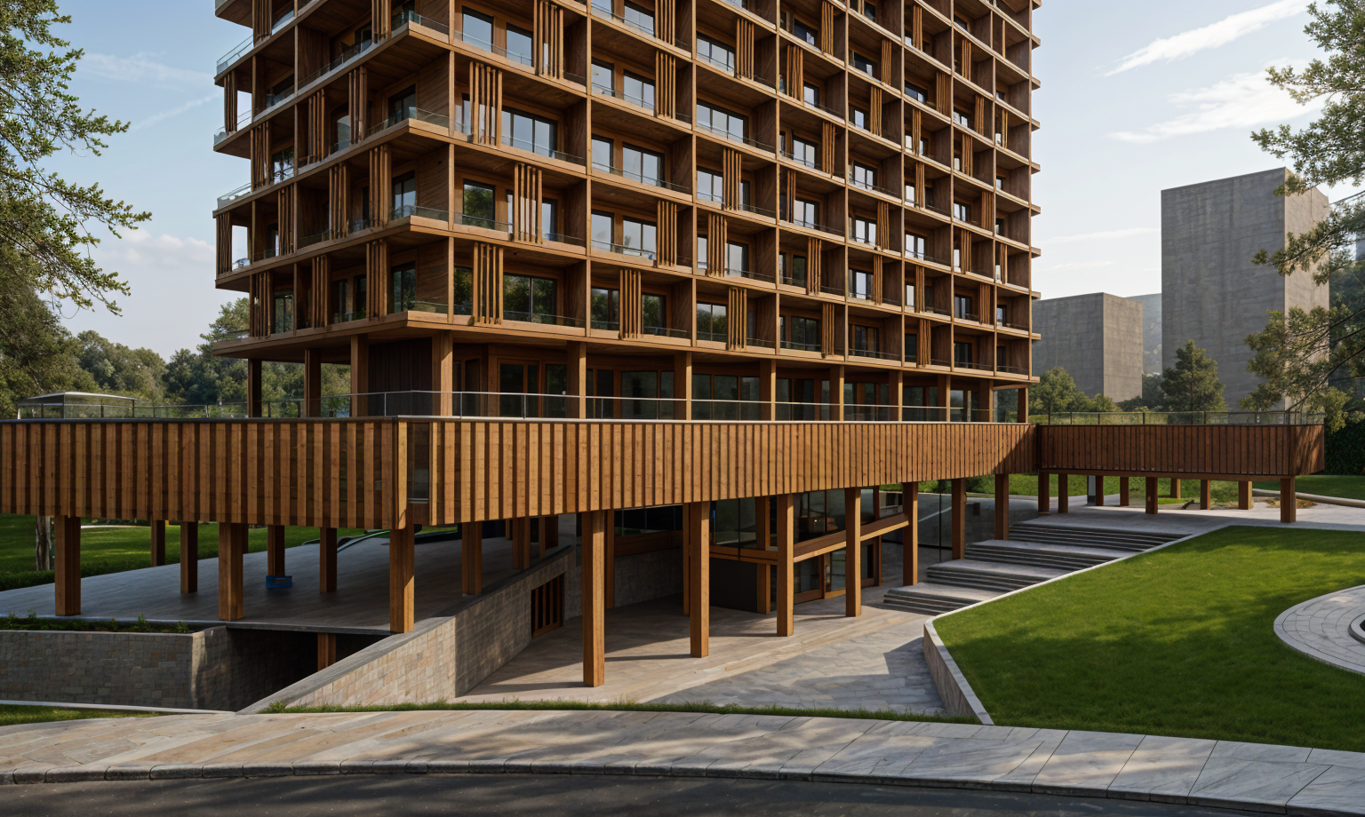 exterior shot render a modern architectural building with a warm wooden facade using rich cedar and oak tones the surrounding environment features lush vibrant greenery with fresh green grass and mature trees the sky is a bright clear blue with soft white clouds the atmosphere is serene and inviting evoking a sense of tranquility and harmony with nature