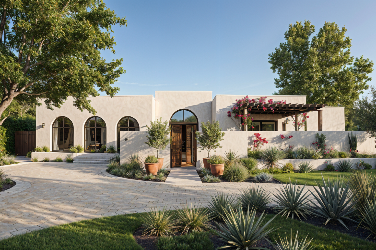 maintain white bright stucco remove large tree on left replace agave with lush clusia shrubs