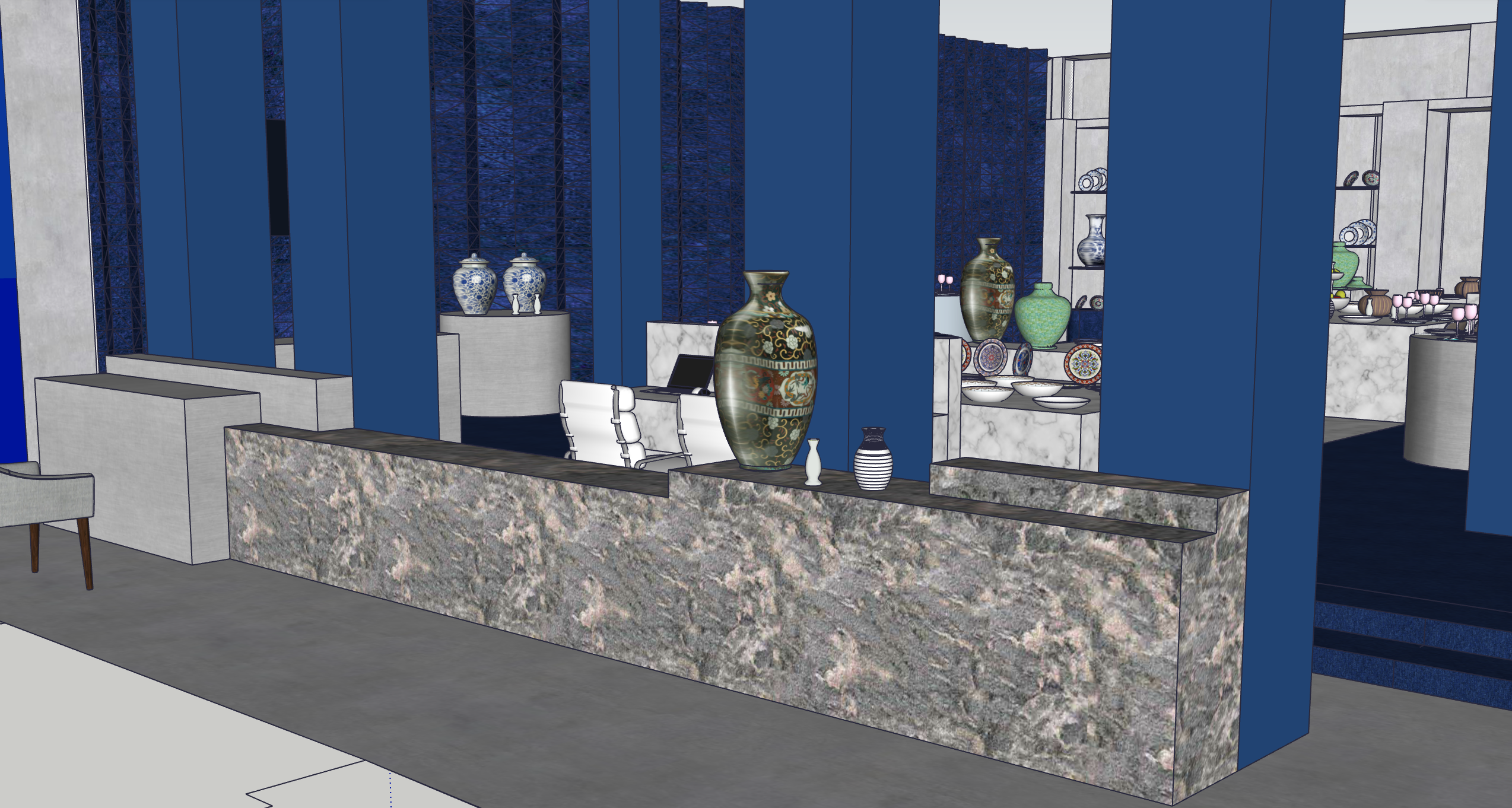 front desk of a ceramic store the desk is stone and concrete the floor is concrete the columns are blue and on the background there is a blue velvet curtian