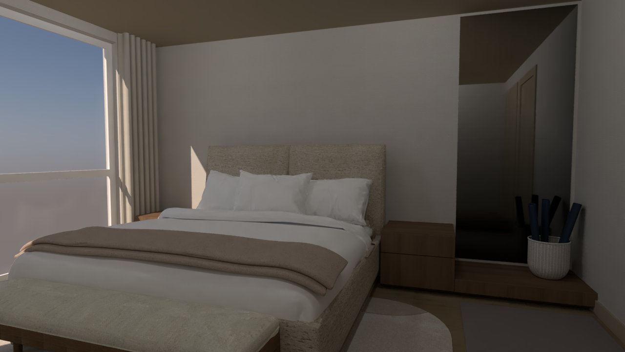 brighten mirror add trees in an urban backyard outside of window to the left keep inside exactly as is