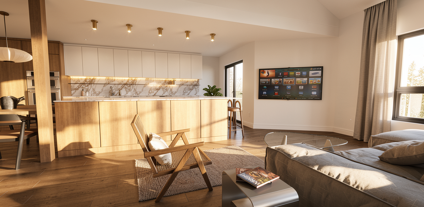 floor wooden planks light oak interior walls and ceiling interior plaster with wall paint skimming stone wooden windows in oak hel black light tracks modern warm gold lightning dark brown wooden tables oliv green metal chairs with a bar bar on the side and with big houseplants on the floor with semi transparent walking people inside and people sit at tables and drink wine a waiter with a white waiter s jacket goes to the guest with a tablet style scandinavian minimalism clean geometry high realism soft warm lighting color oft he lightning warm yellow beige camera eye level from the front sundowner with soft shadows few clouds in the sky birds flying can be seen through the windows some trees include a glass railing around a planted tree existing tree preserved realistic reflections and light