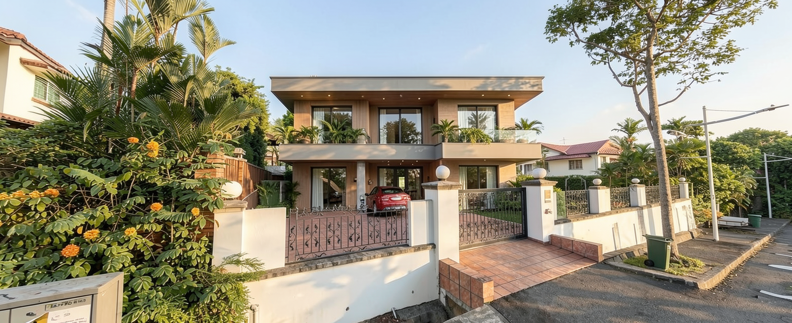 redesign into a symmetrical modern 3 storey luxury house by scda and change the boundary wall and gate design