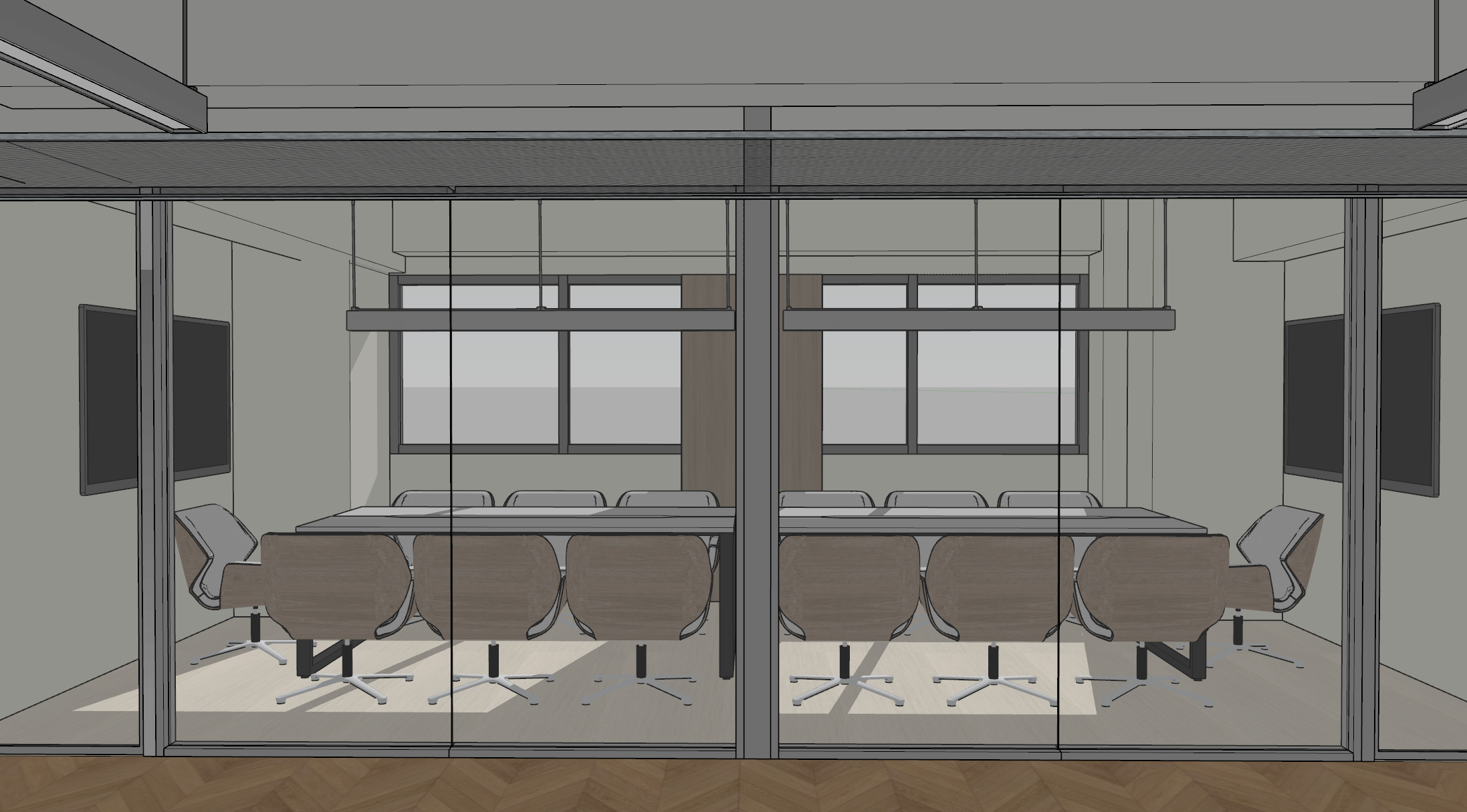 modern office interior featuring rows of sleek light colored walnut chairs and minimalist white desks set against soft gray walnut walls natural light pours in through large windows creating a bright and airy atmosphere the ceiling is dotted with contemporary linear lighting fixtures adding a touch of elegance the floor in front is adorned with a gray walnut herringbone pattern enhancing the sophisticated ambiance the metal frame for the glass gives a white color the floor of the conference room is a slightly darker beige carpet finish above the herringbone floor is expanded metal mesh ceiling covering up the floor slab with a dark grey finish maintain the camera angle and scale