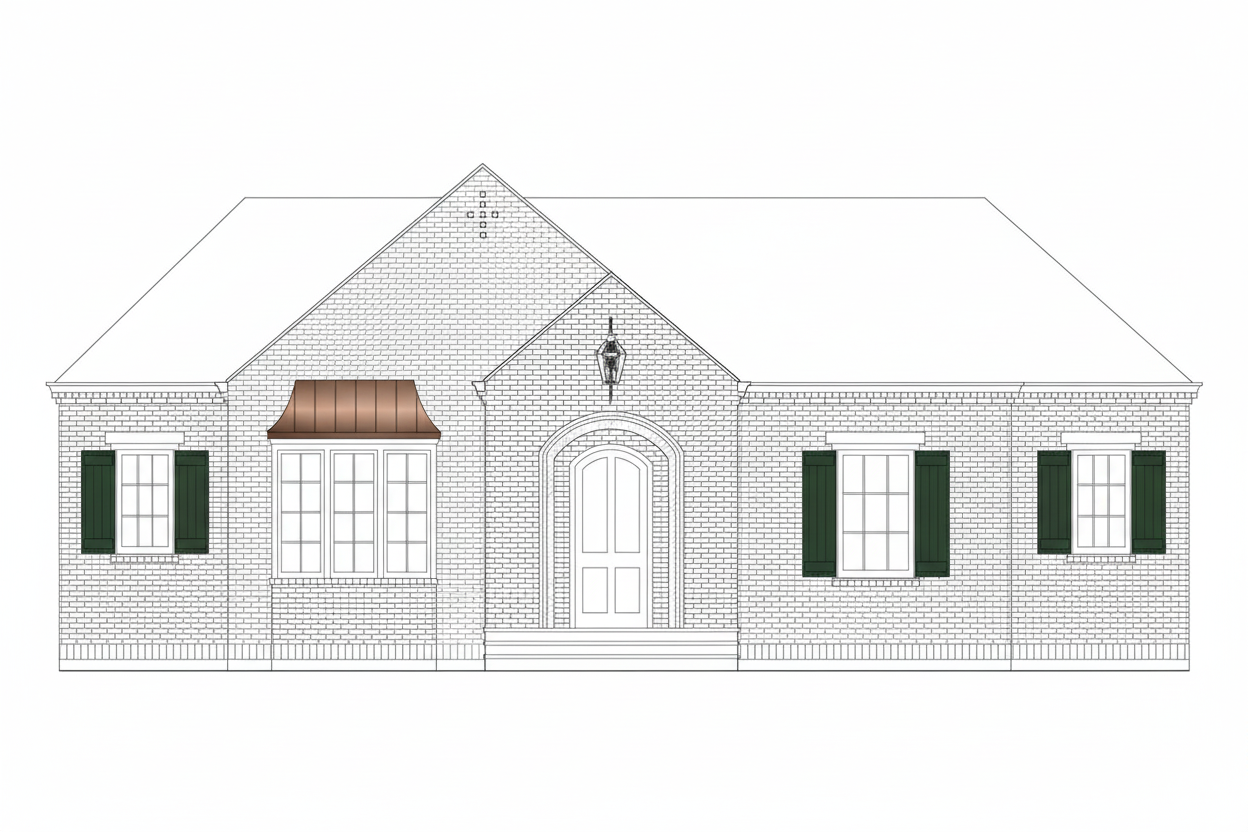 brick veneer with german schmear dark green board and batten shutters brick eave with corbels copper roof over bay window only