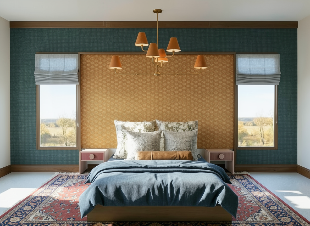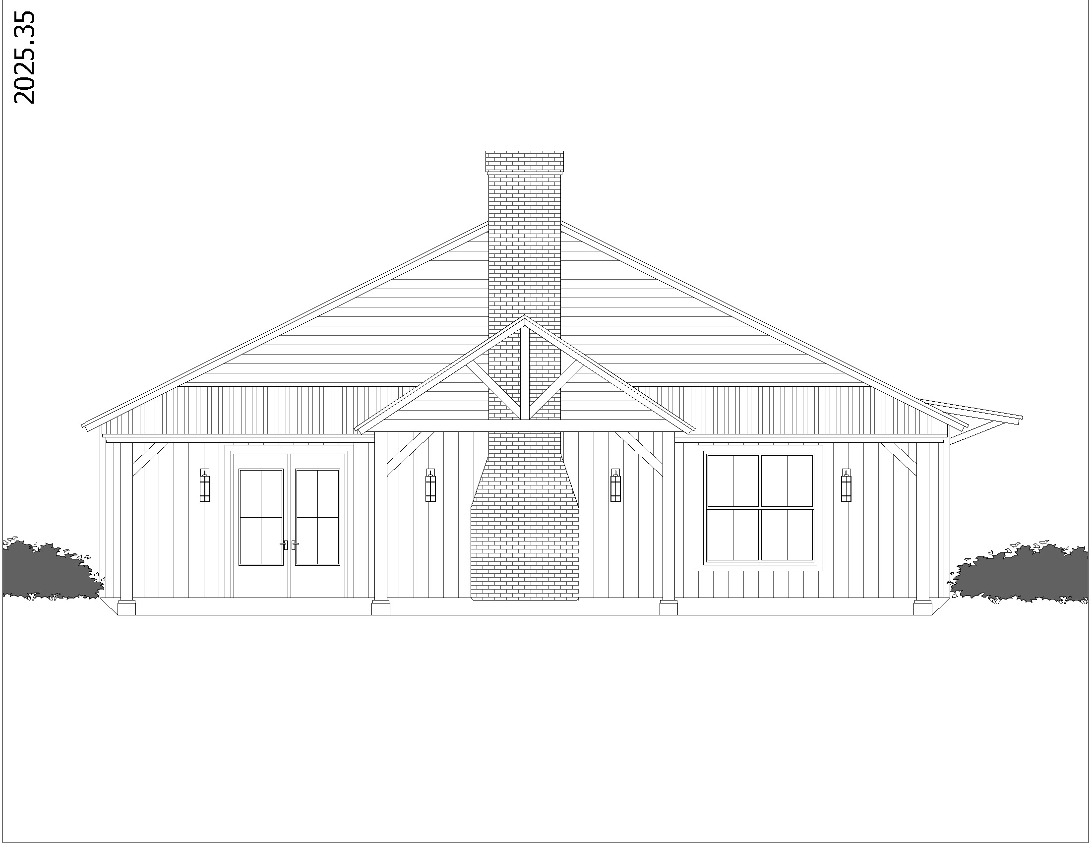 charming retirement facility with a 15 foot front porch across the front add seating with rocking chairs and tables siding to be vertical board and batten on the lower half and horizontal siding in the back wall of the gable roof to be dark shingle double front door to be dark cedar with large windows windows to be dark frames cedar accents with wall mounted lanterns zoom out to show full house landscape to be country setting zoom out and show full house