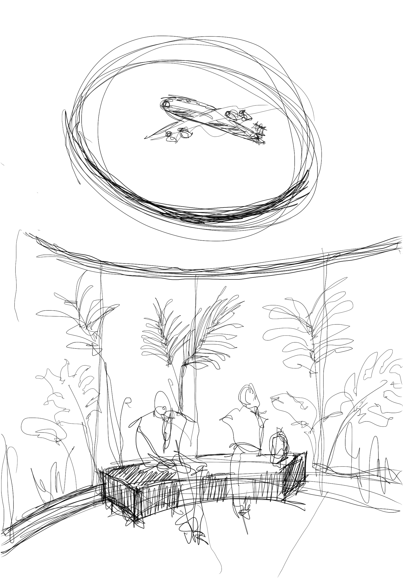 transform this freehand interior architectural sketch into a high end photorealistic architectural visualization of an offstage wellness and respite space for united airlines staff at san francisco international airport critical interpret the sketch faithfully while preserving intended layout proportions and perspective maintain original camera viewpoint and spatial composition do not redesign the architecture refine and resolve into a realistic buildable environment clean and straighten geometry where needed while maintaining design intent program intent space type private offstage staff wellness decompression reset environment not public facing designed for airline staff retreat between shifts emphasis on calm mental reset reduced sensory load and restorative atmosphere subtle alignment with united airlines identity without overt branding core design feature curved resin wall introduce a soft three dimensional flowing curved wall or enclosure element material translucent resin panels with embedded organic plant pattern panels are backlit with soft diffuse illumination lighting should create a layered glowing effect through the plant pattern geometry should feel fluid and continuous sculptural but minimal avoid overly complex forms maintain elegance and clarity core design feature skyspace skylight incorporate a ceiling aperture inspired by james turrell skyspace installations clean minimal opening with precise edges soft controlled daylight entering from above sky view should feel framed serene and immersive through the opening include a subtle distant view of a united aircraft passing in the sky aircraft should be small quiet and poetic not dominant or literal light quality should shift gently creating a contemplative atmosphere materials warm natural calming palette light wood or cork flooring soft plaster or clay toned walls acoustic fabric panels where appropriate minimal contrast tonal harmonious material transitions high performance durable materials suitable for airport back of house use lighting primary soft daylight from skylight secondary warm concealed lighting 2700k 3000k resin wall provides a glowing ambient layer avoid harsh or direct lighting everything should feel diffused and calming subtle gradients of light and shadow furniture minimal comfortable wellness oriented lounge seating recliners or daybeds small quiet seating clusters soft tactile materials wool felt leather avoid clutter maintain open breathable space detailing integrated seamless construction hidden or minimal technology presence acoustic softness panels surfaces no visible branding signage or screens environment fully interior focused introspective space no busy exterior views except controlled skylight moment atmosphere should feel removed from airport activity render style photorealistic architectural visualization in the style of dbox mir luxigon soft atmospheric slightly ethereal but grounded in realism gentle contrast subtle glow refined material realism mood quiet restorative contemplative almost meditative emphasis on mental reset and well being light as the primary experiential driver output ultra realistic competition level architectural rendering with a strong emotional and atmospheric quality