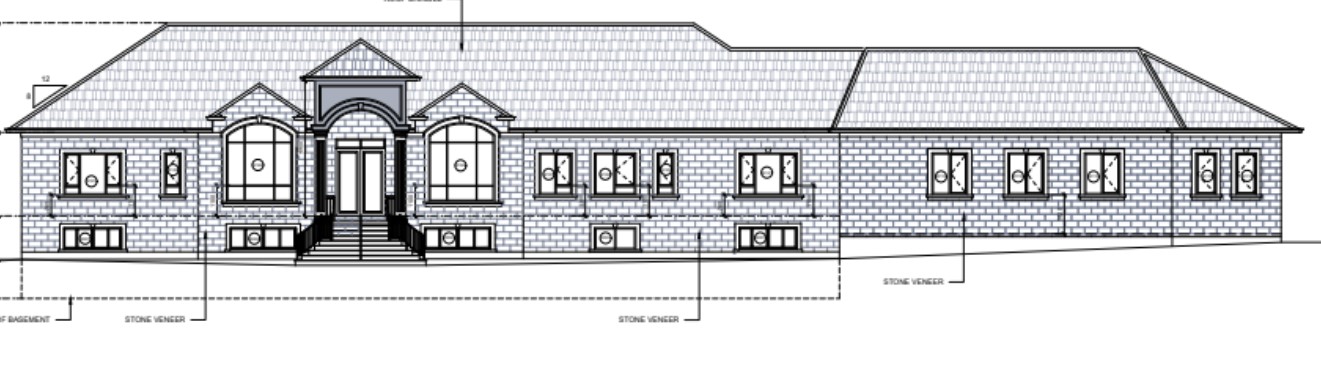 can you illustrate this drawing exactly to scale but with white stone and black roof and make the front entryway and two side peaks look a bit better aesthetically can you make the stone bigger white stones and the front facade above the entryway can you not put any shingles make it all stone