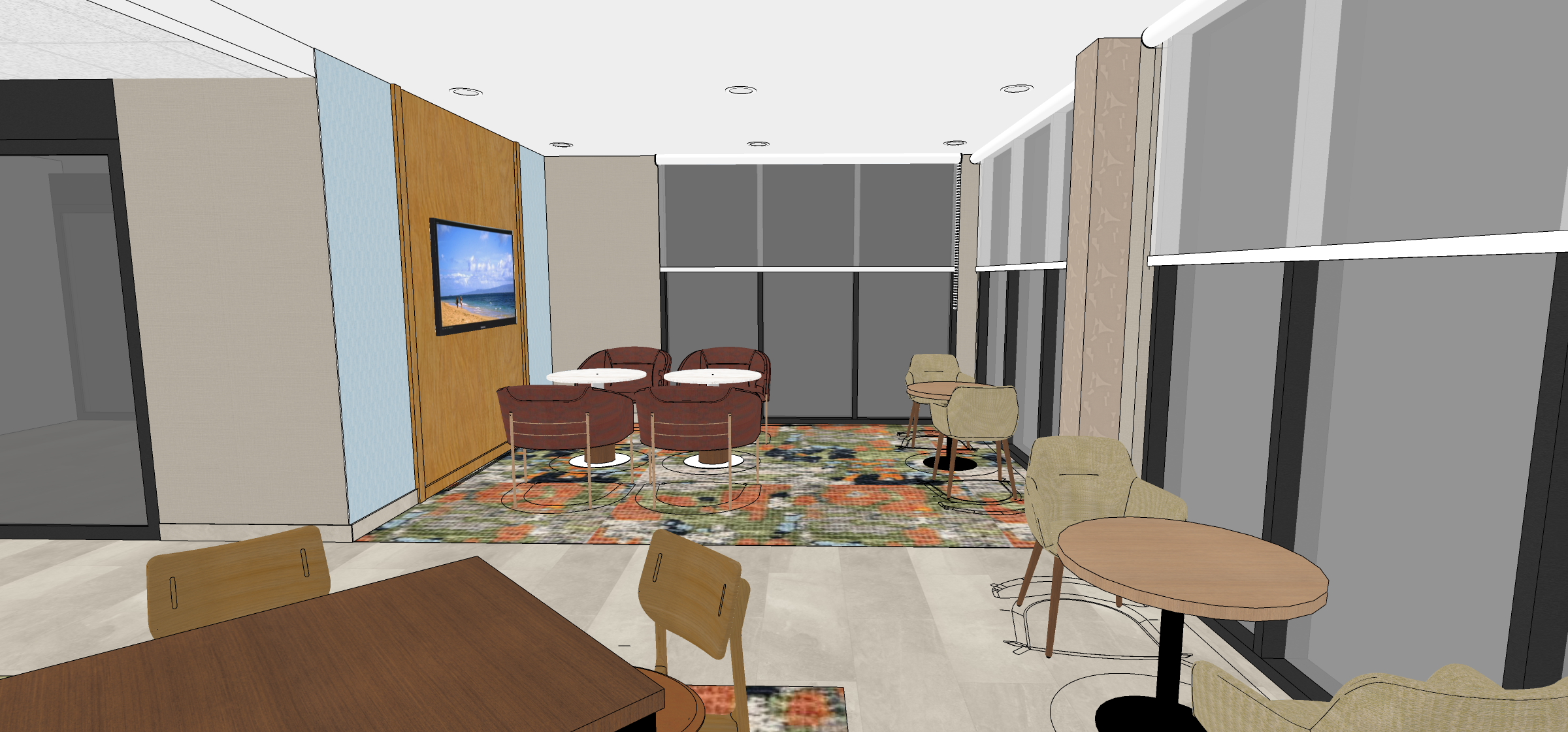 do not alter colors materials or building elements create an interior photorealistic rendering with soft lighting and soft shadows add outside trees and plants and a parking lot visible through the windows minimal sunlight should enter the space